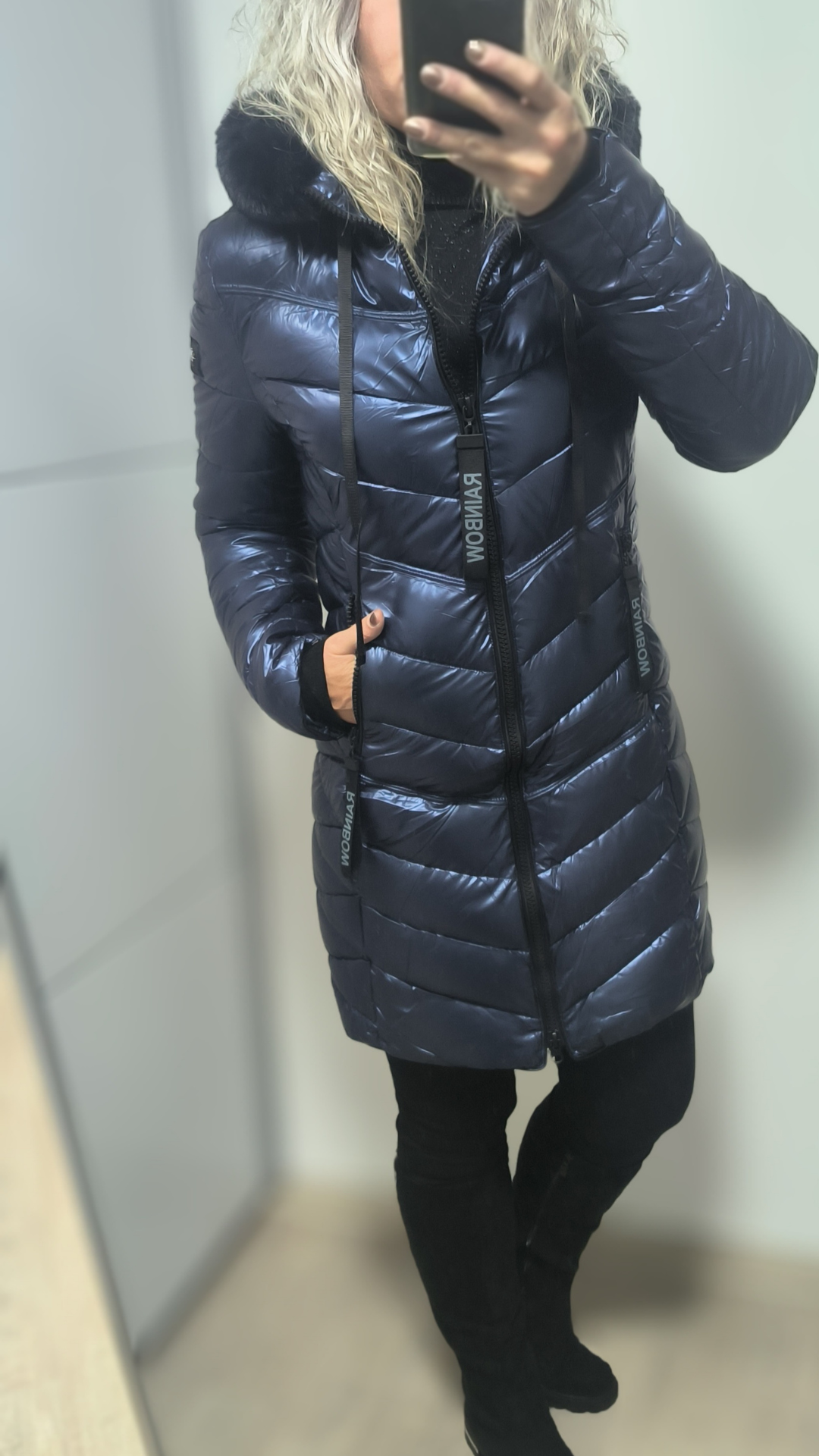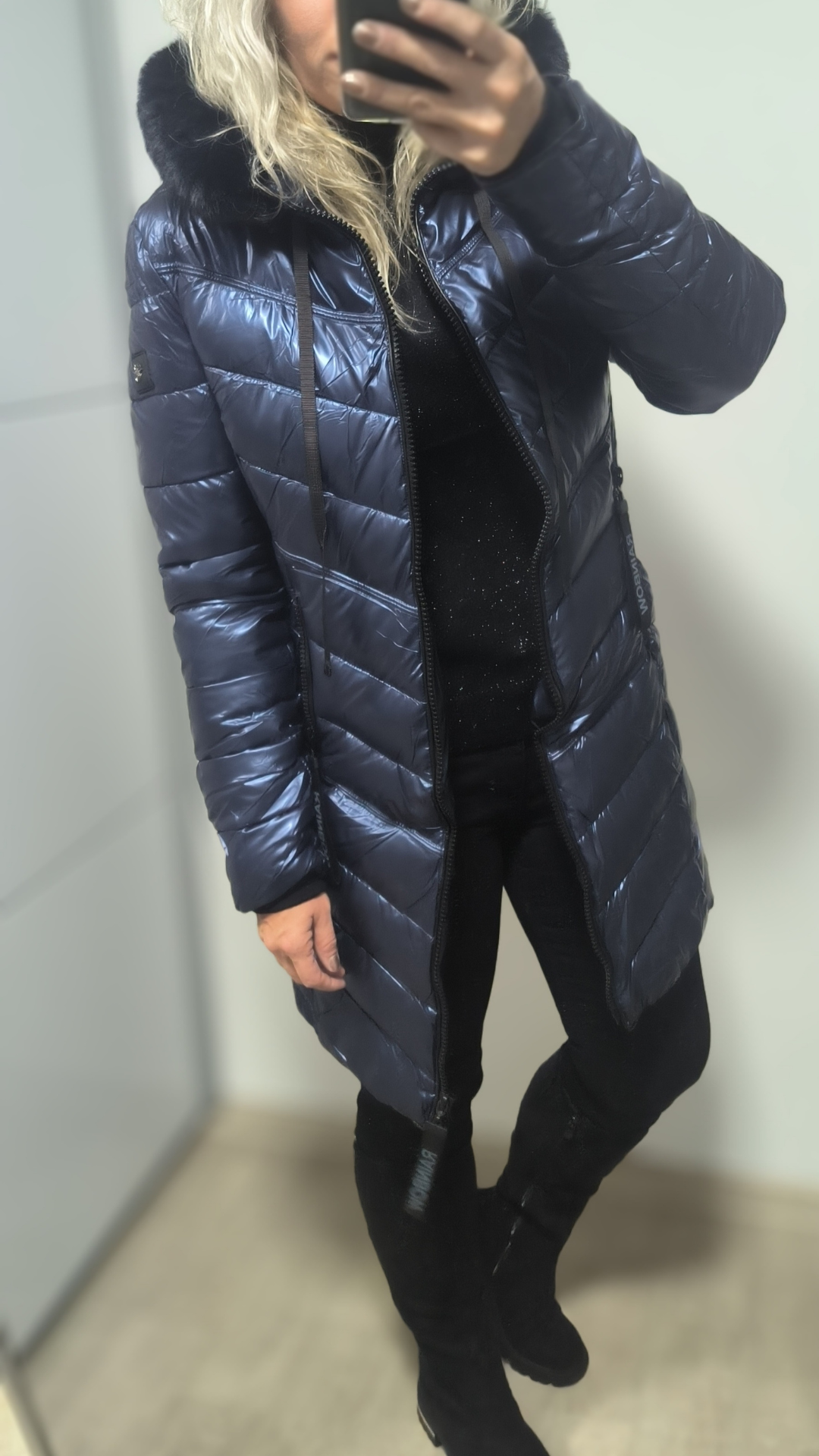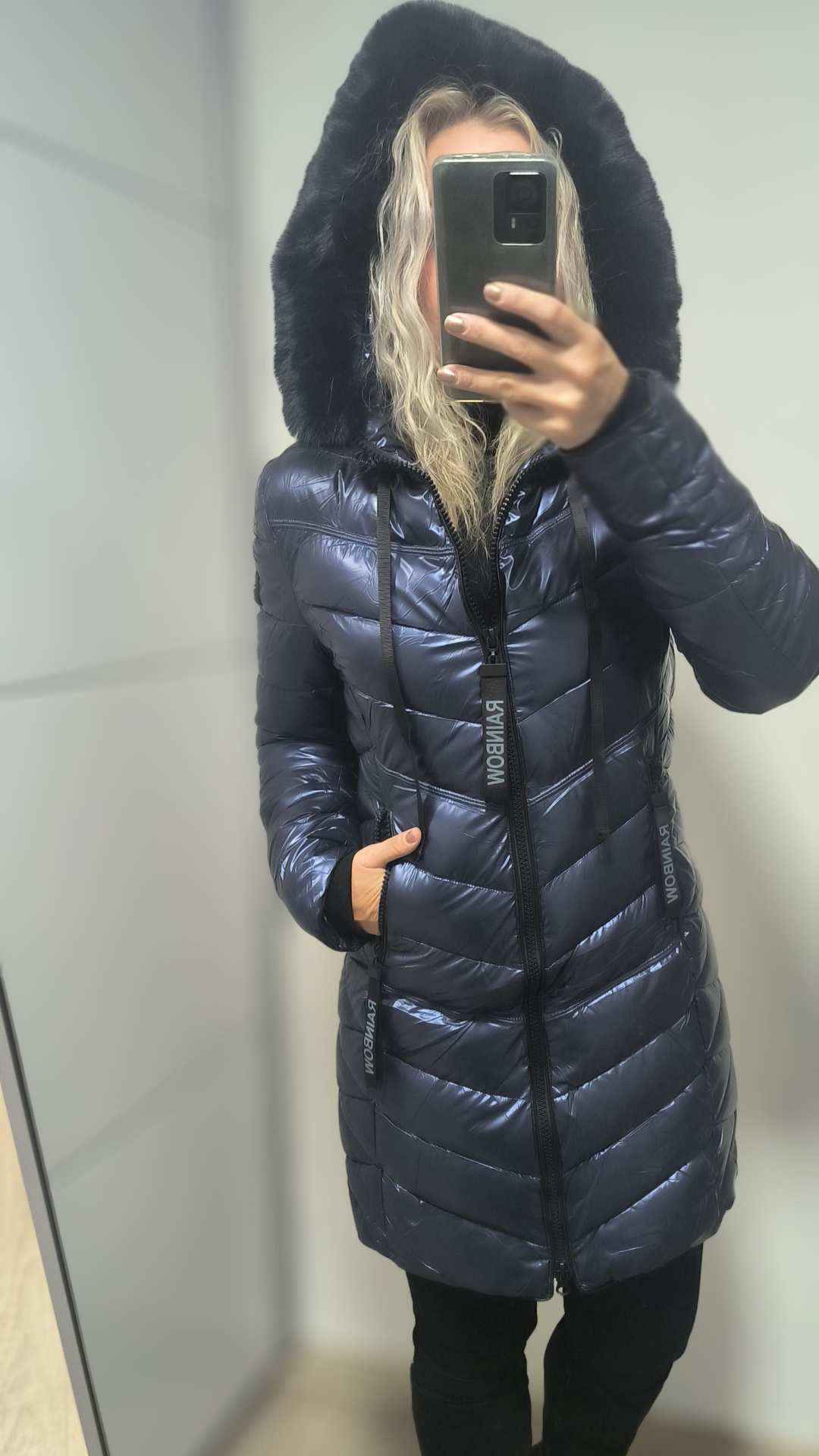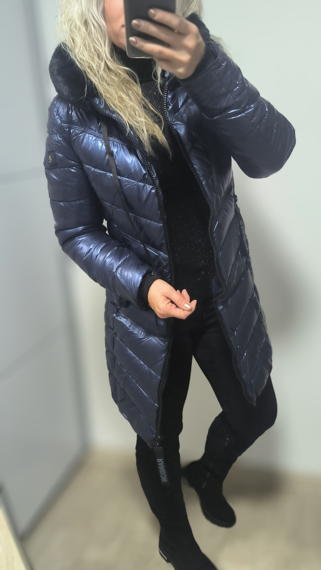 Stylová dámská zimní bunda Mona v elegantní modré barvě s jemným lesklým povrchem. Praktický oboustranný zip a kapuce s hebkým kožíškem zajišťují pohodlí i v chladných dnech. Moderní střih zvýrazňuje postavu a dodává bundě šmrnc – ideální volba pro zimní městský outfit.
