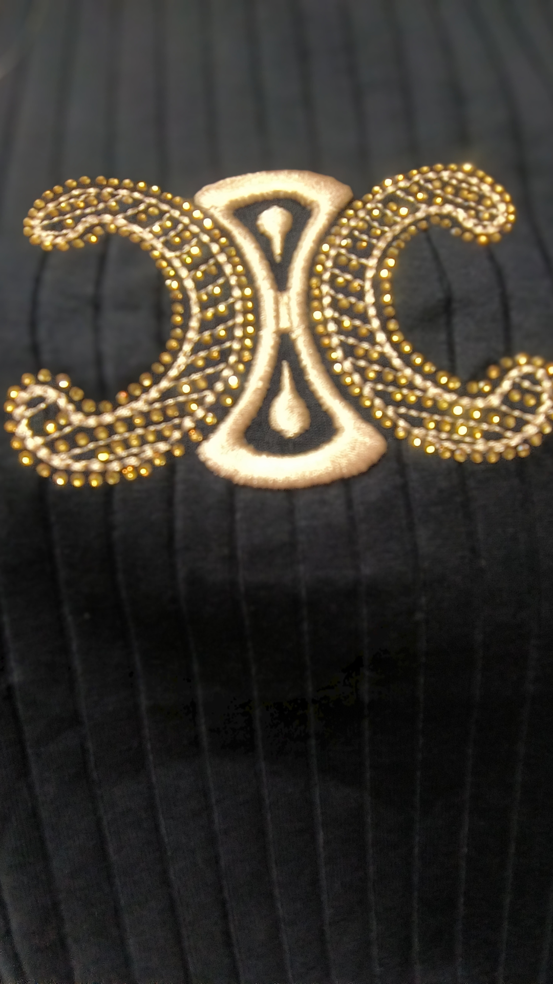 Elegantní dámské černé tričko s dlouhým rukávem, které zaujme. Přední část zdobí vyšitá zlatá aplikace doplněná třpytivými kamínky, které dodávají tričku luxusní vzhled. Na rukávech jsou ozdobné zlaté knoflíky, jež podtrhují celkový styl.