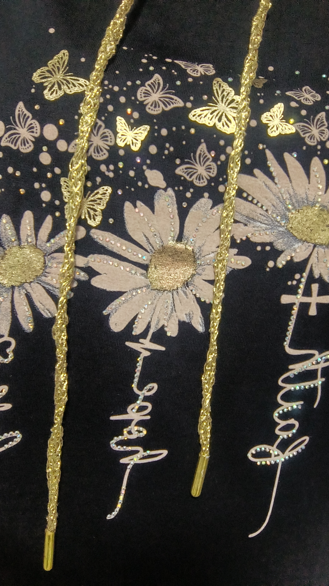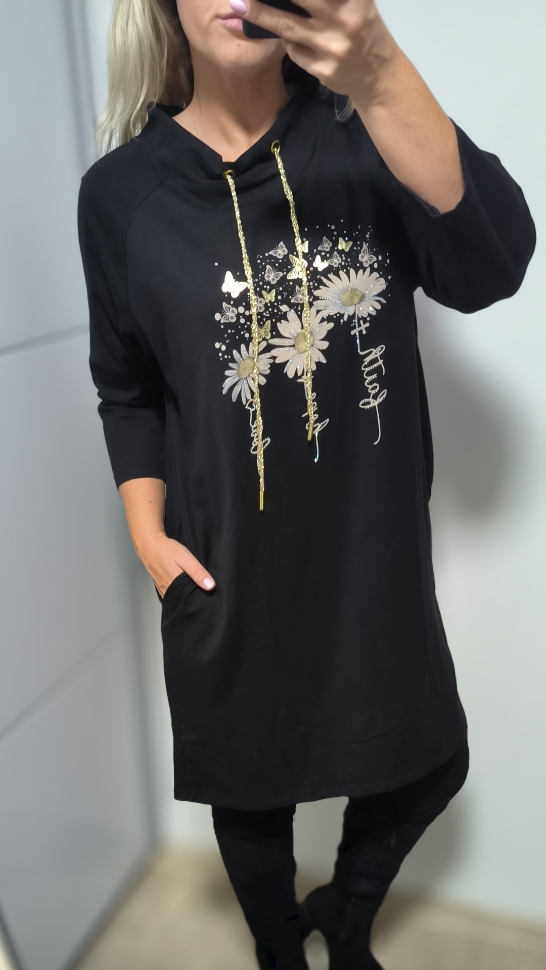 Stylové mikinové šaty v elegantní černé barvě zaujmou originálním květinovým a motýlím potiskem doplněným jemnými kamínky. Kvalitní zlatý potisk a zlatá šňůrka v kapuci dodávají modelu luxusní vzhled, díky kterému je ideální na běžné nošení i na neformální společenské akce.