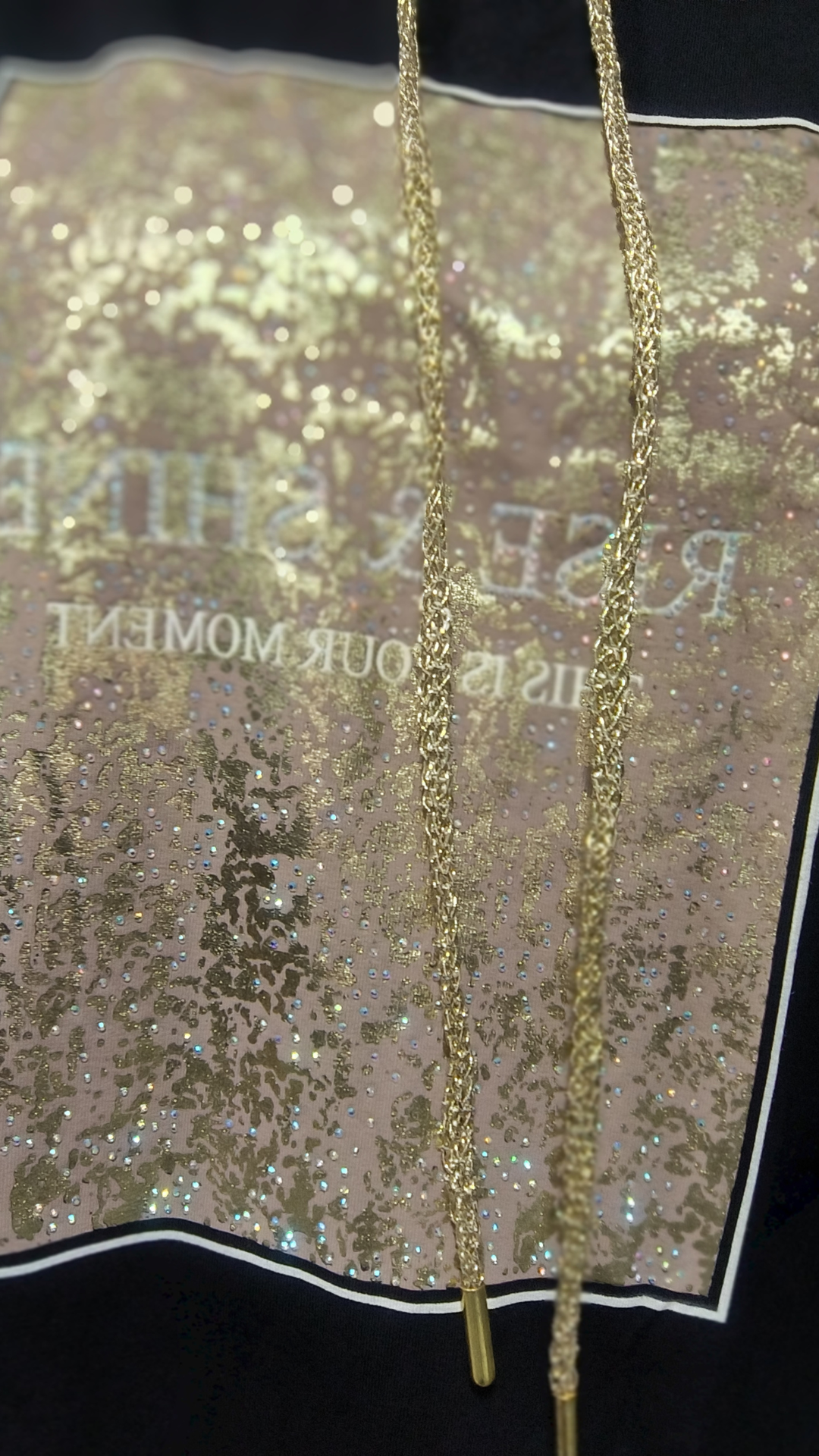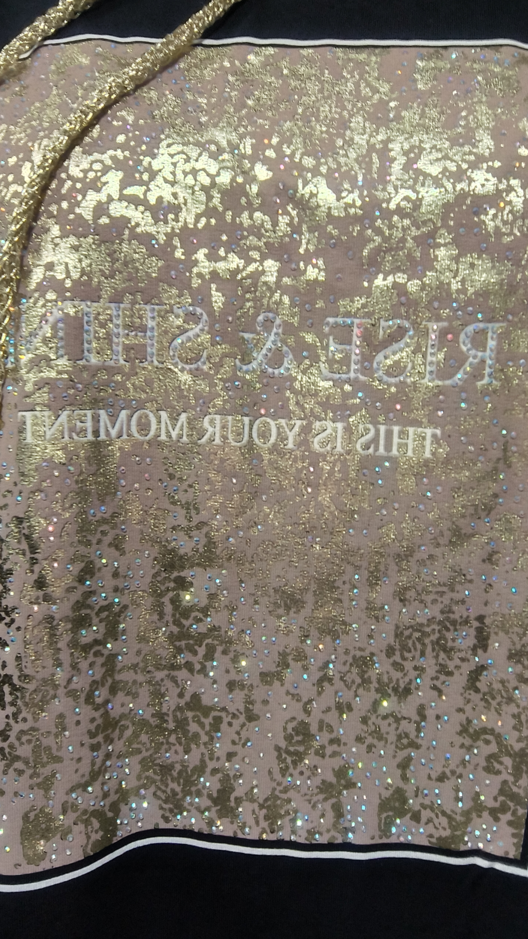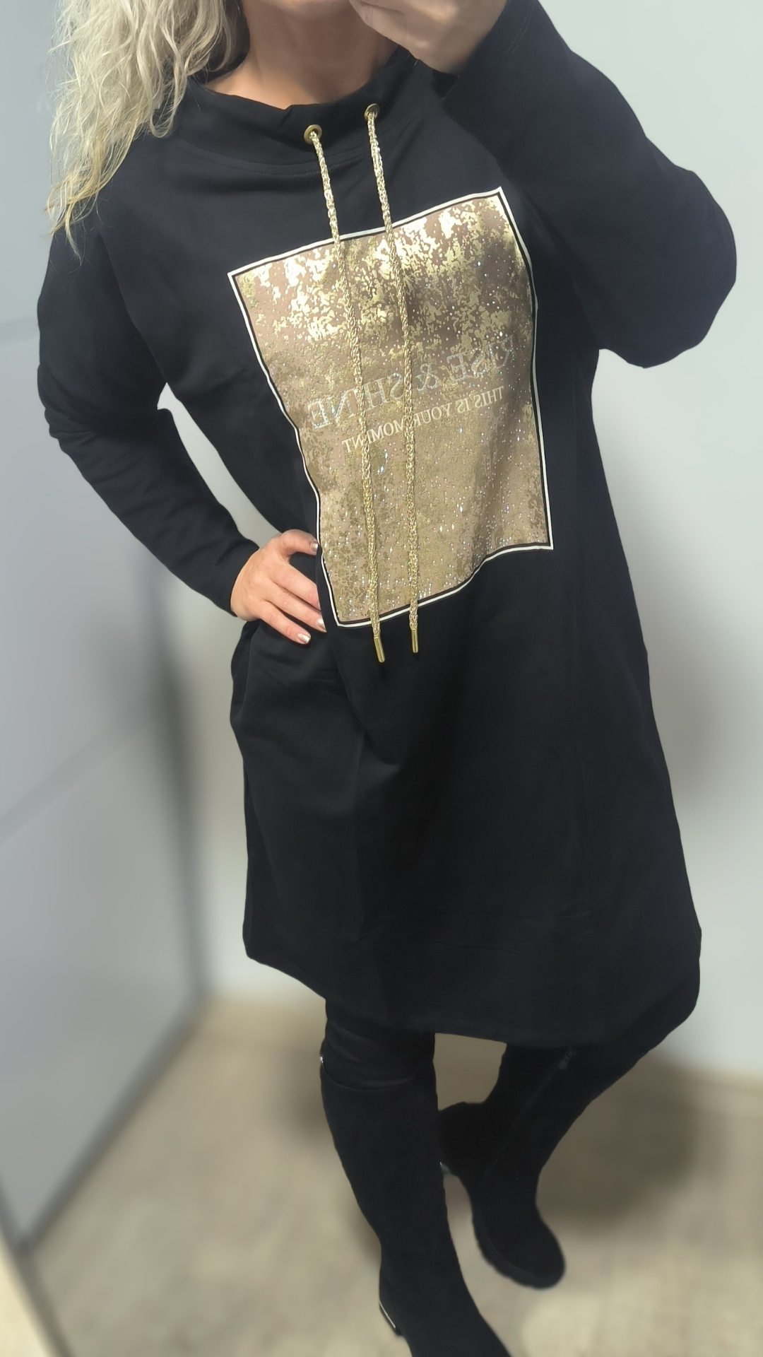 Šaty jsou vyrobeny z měkkého, příjemného materiálu, který se krásně přizpůsobí postavě. Mají praktické kapsy, zlatou tkaničku a okouzlující zlatý potisk zdobený kamínky, který dodává šatům jedinečný šmrnc.