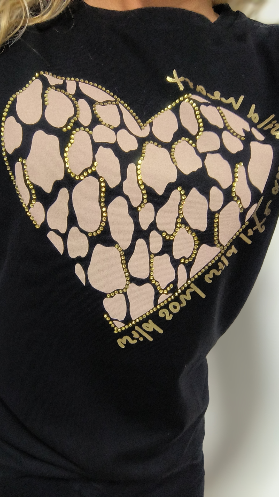Přidejte do svého šatníku romantický kousek s dámským tričkem Amara. Tento model s dlouhým rukávem zaujme originálním hnědo-zlatým potiskem ve tvaru srdce zdobeným jemnými kamínky.