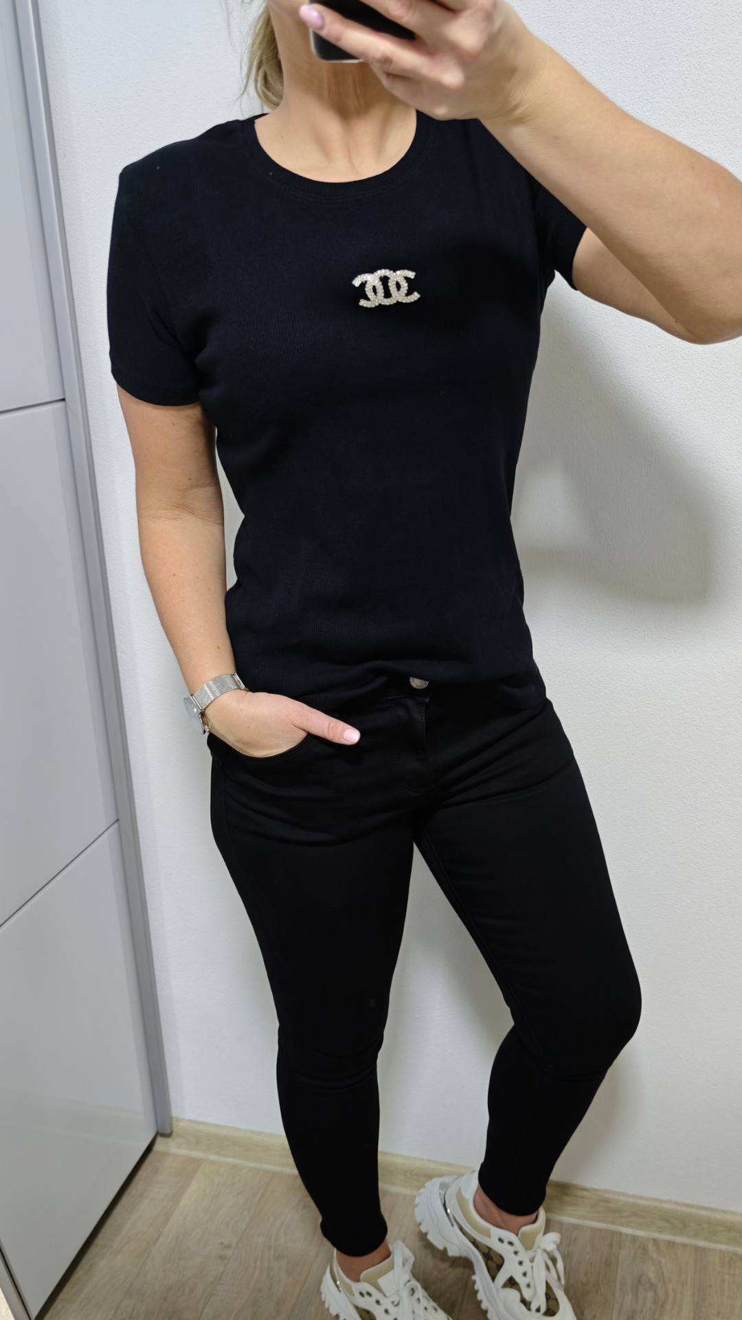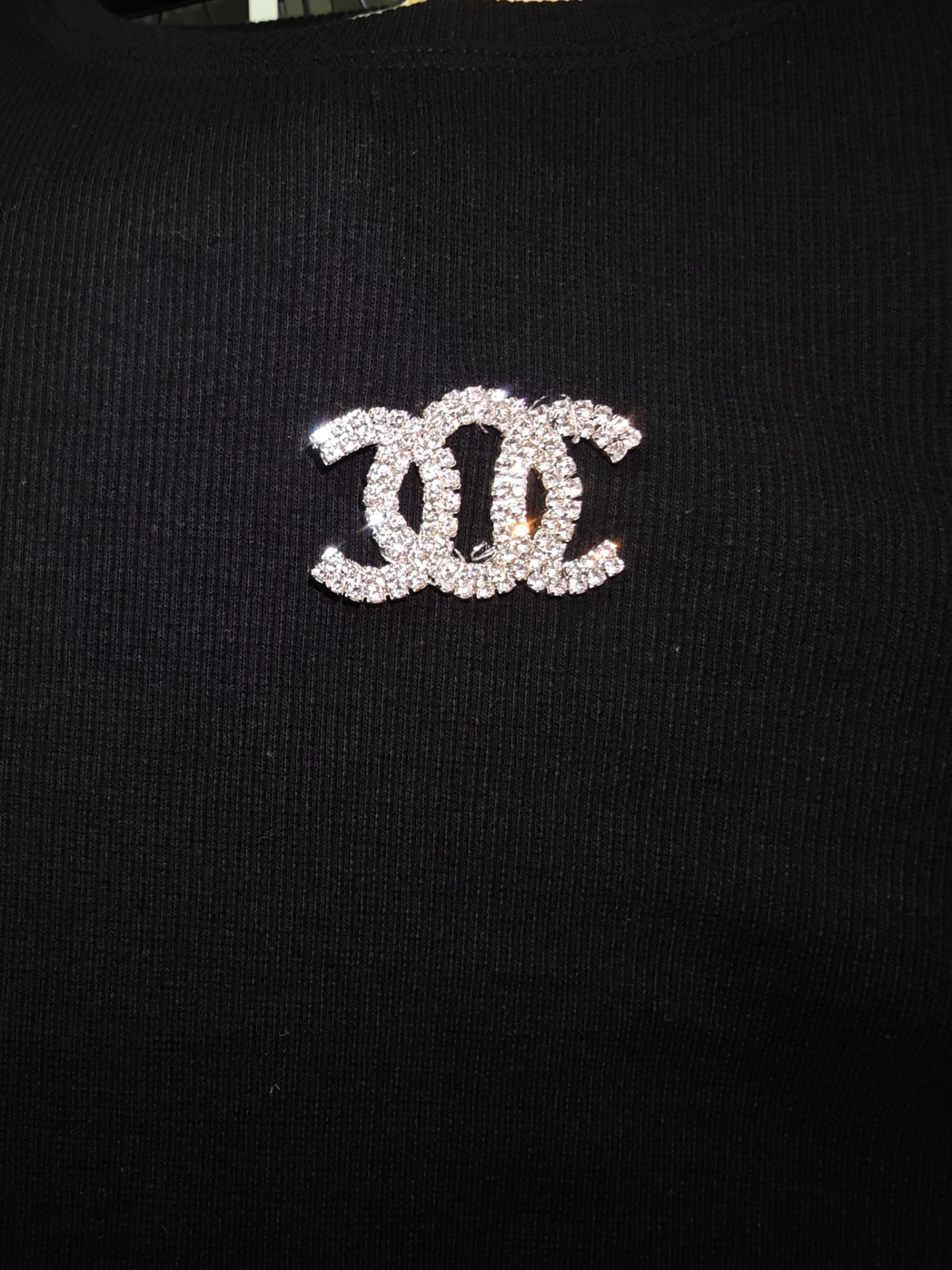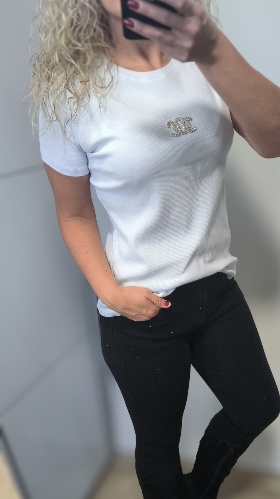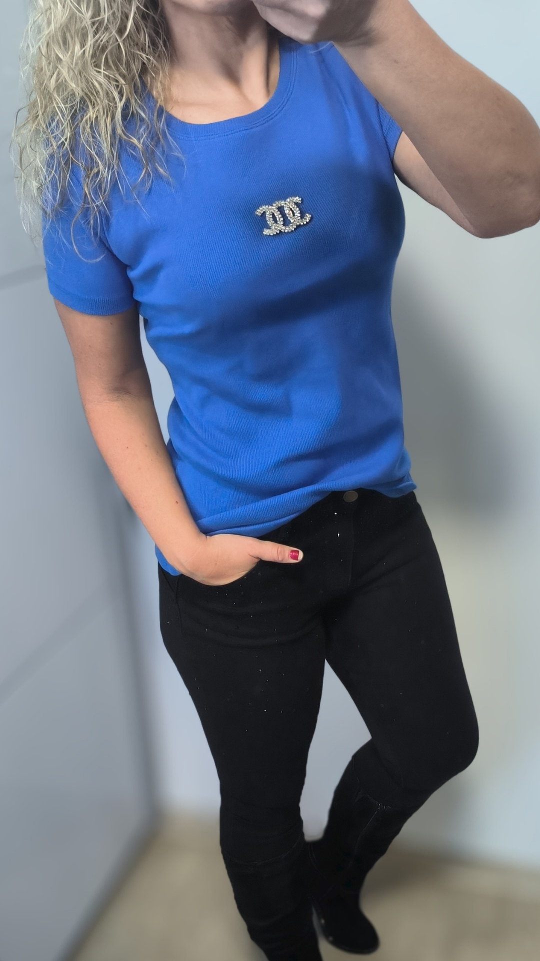 Přední část zdobí efektní aplikace z kamínků, která dodává tričku jemný lesk a eleganci.