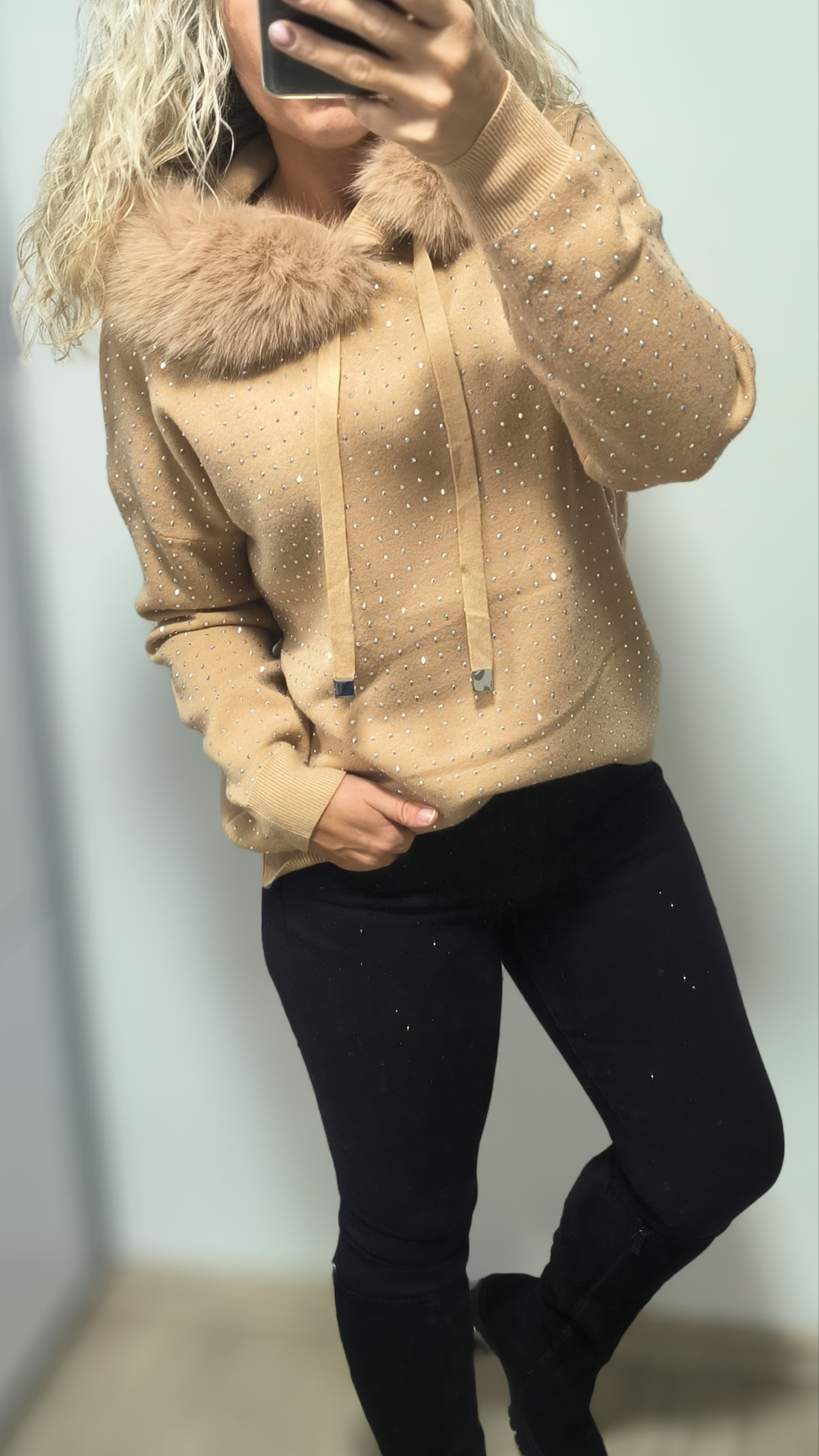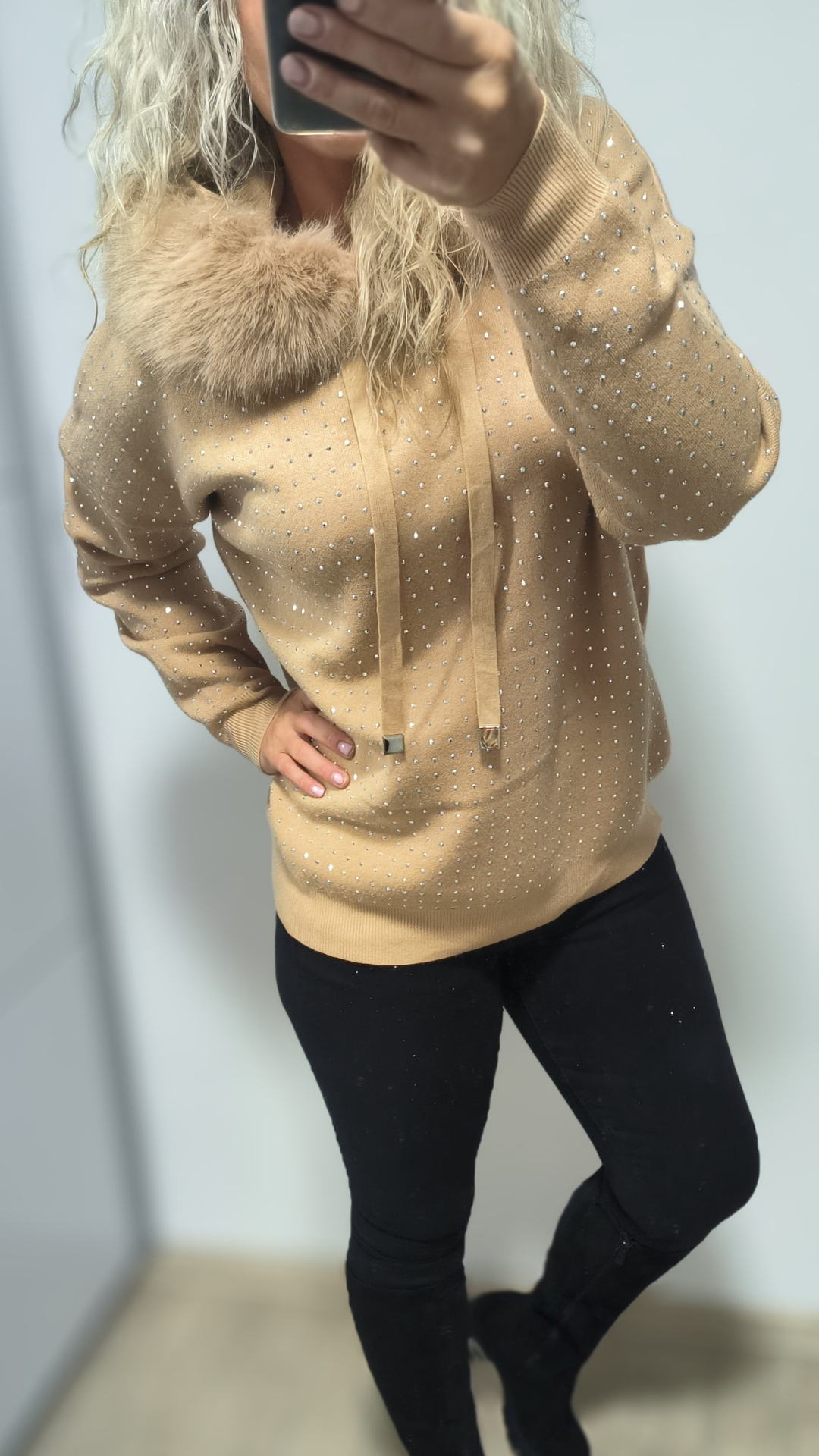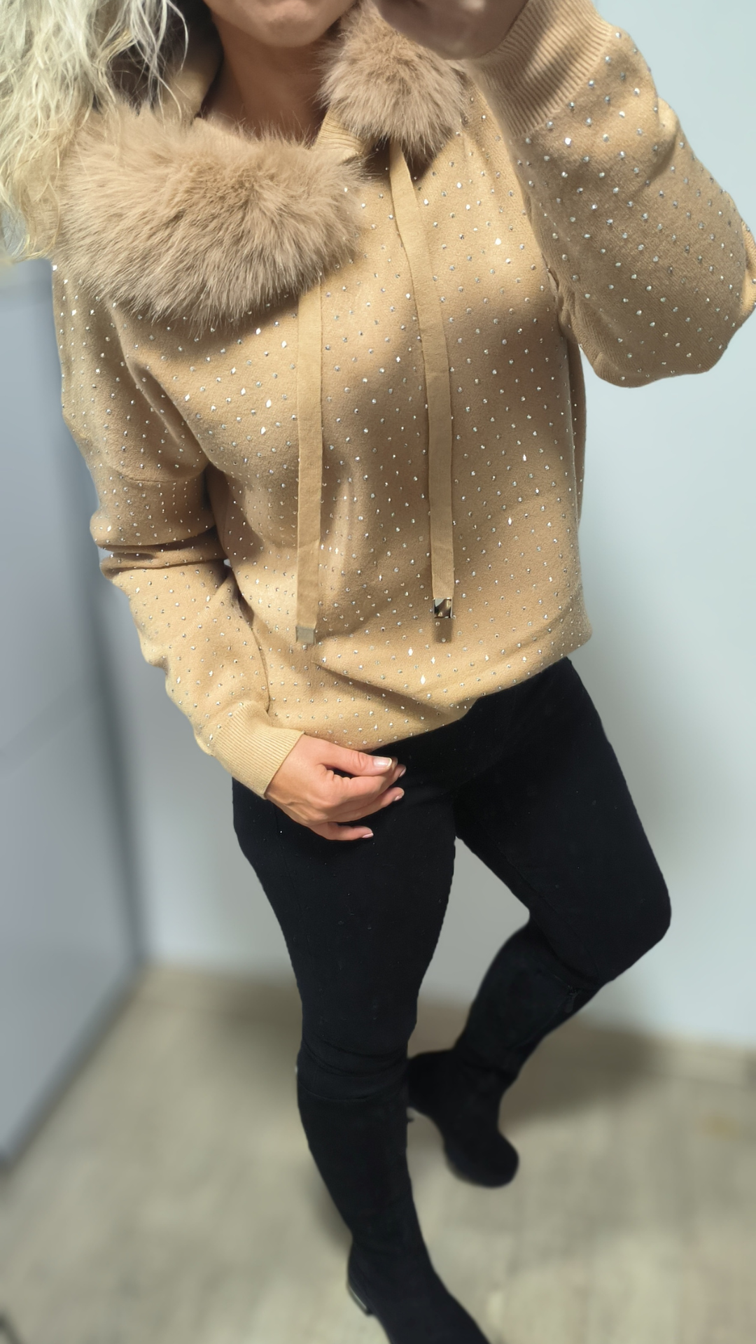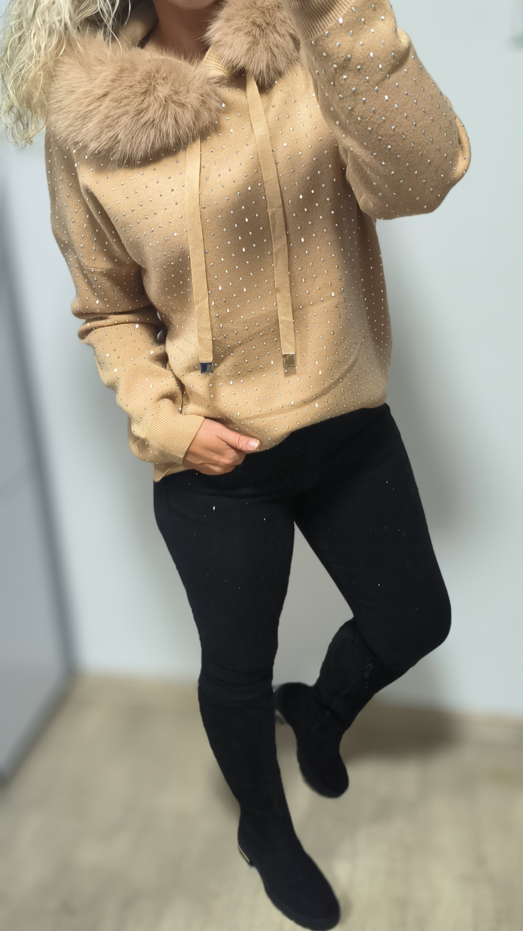 Zahal se do stylu a pohodlí s naším exkluzivním svetrem Crystal – ideálním společníkem na chladnější dny. Tento elegantní dámský svetr s kapucí a jemně třpytivými kamínky přináší nejen teplo, ale i šmrnc.