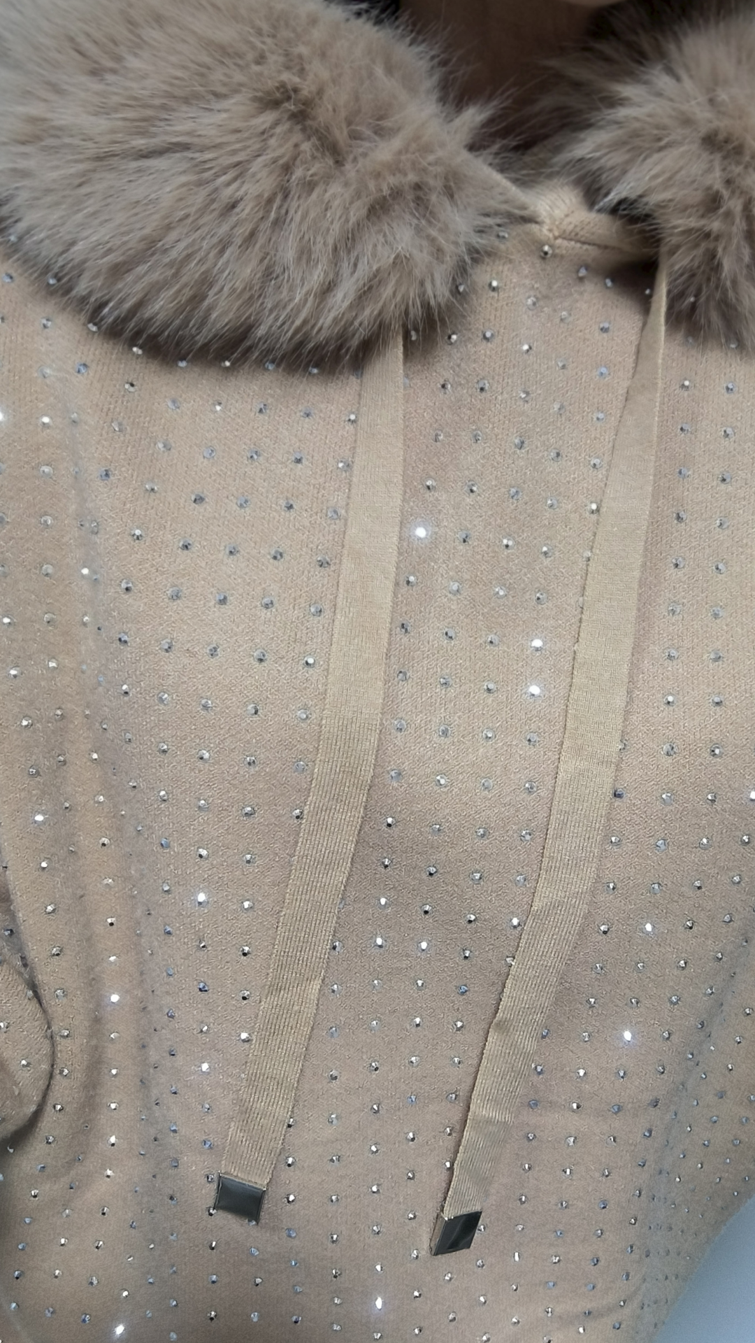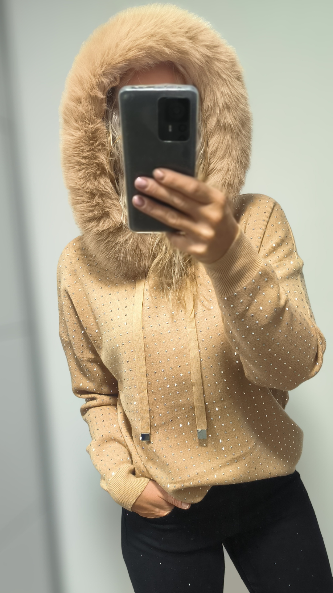 Dámský svetr Crystal – s kapucí, kamínky a odepínací kožešinkou