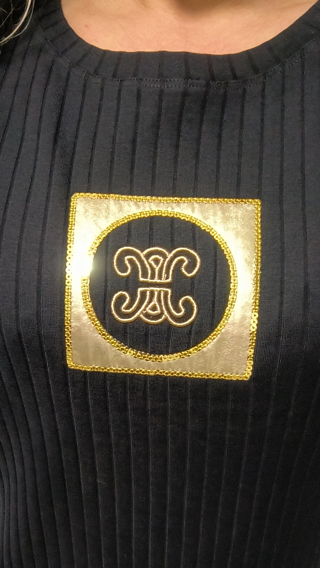 Elegantní, ale přitom pohodlné – přesně takové jsou tyto dlouhé černé šaty se zlatou aplikací na prsou. Spojují sportovní ležérnost s jemným luxusem, díky čemuž se hodí jak na běžné nošení, tak i na večerní příležitosti.