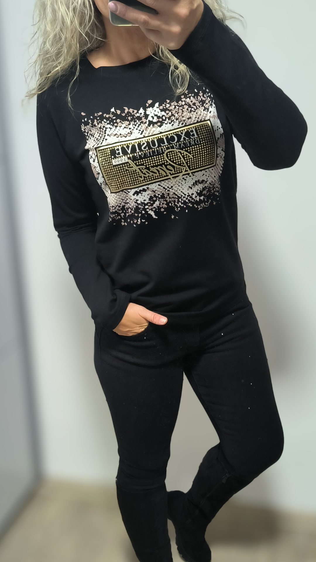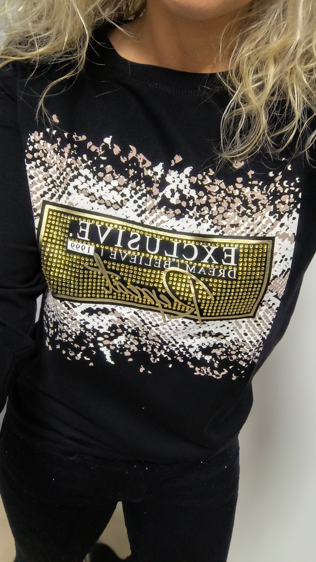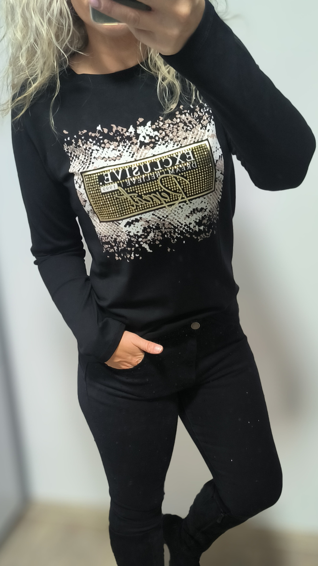 Pohodlné dámské tričko s dlouhým rukávem v černé barvě, doplněné potiskem se zlatými kamínky na přední straně. Skvělý kousek pro každodenní nošení – snadno ho sladíte s džínami, legínami i sukní.