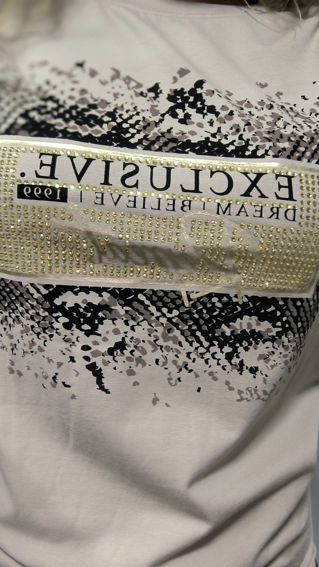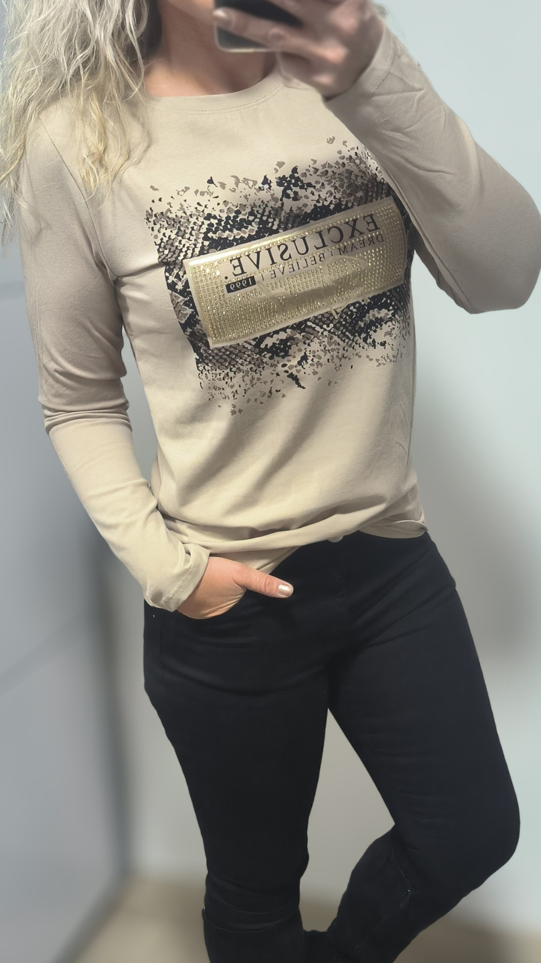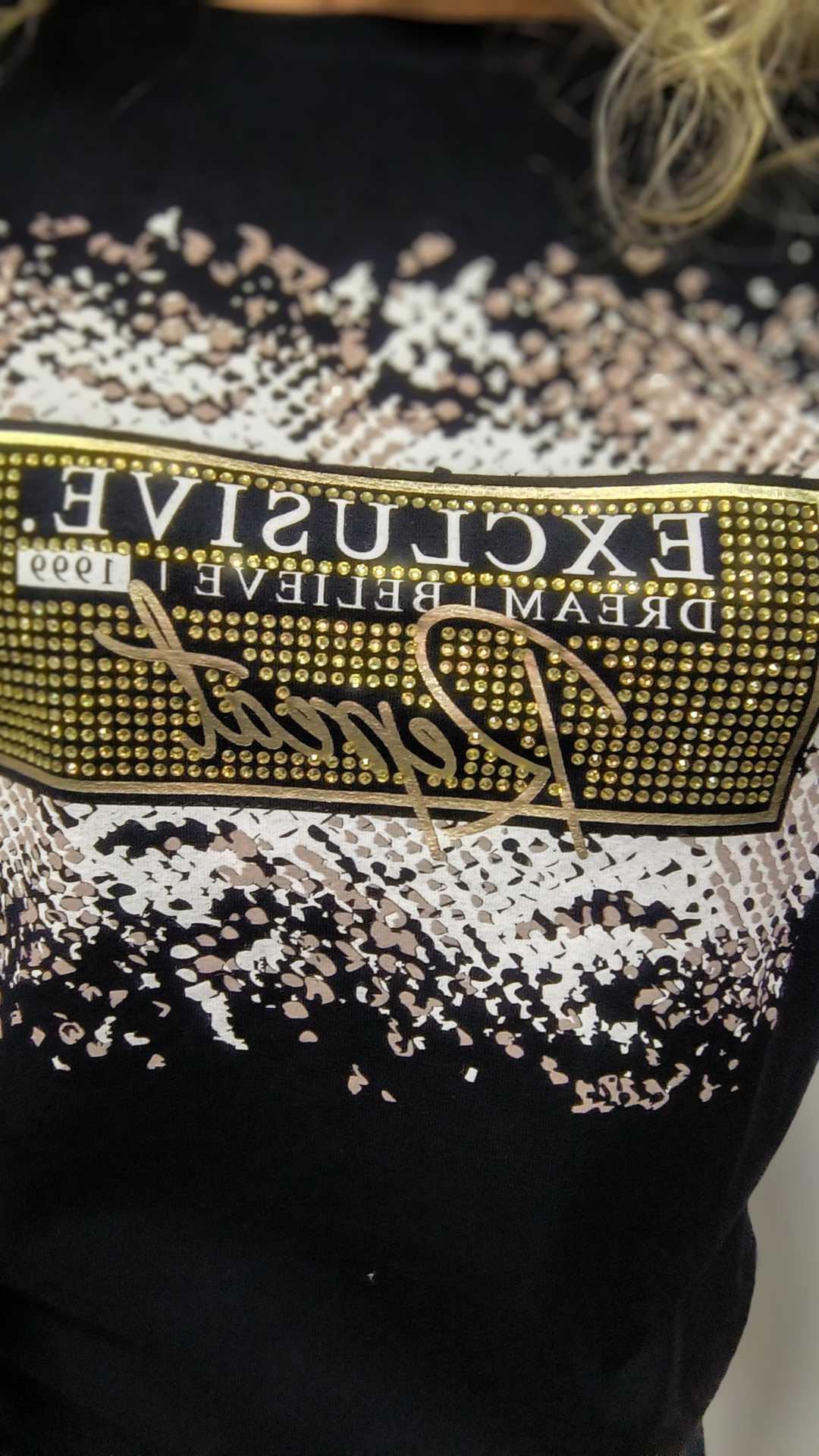 Pohodlné dámské tričko s dlouhým rukávem v černé barvě, doplněné potiskem se zlatými kamínky na přední straně. Skvělý kousek pro každodenní nošení – snadno ho sladíte s džínami, legínami i sukní.