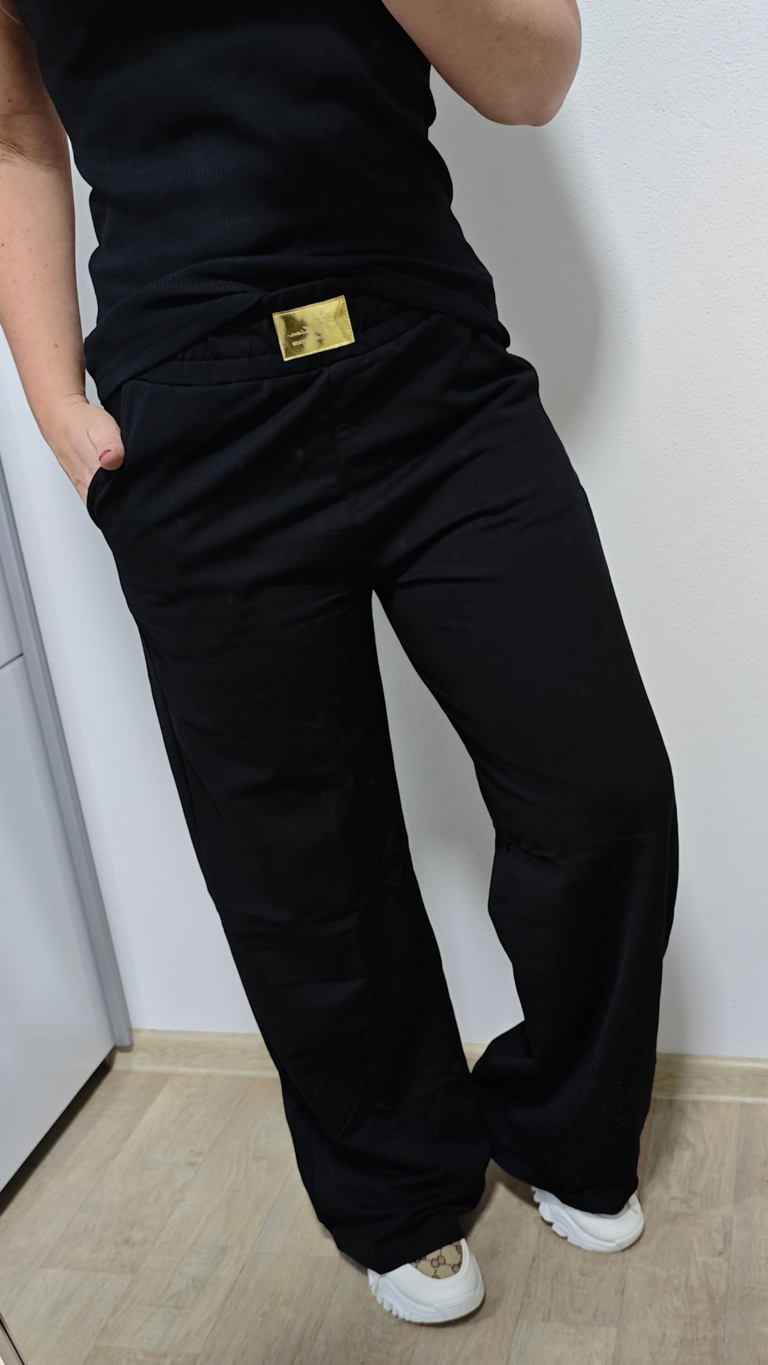 Elegantní zlatý dekorativní štítek dodává kalhotám jemný luxusní detail, který z nich dělá stylový kousek nejen na doma, ale i do města.