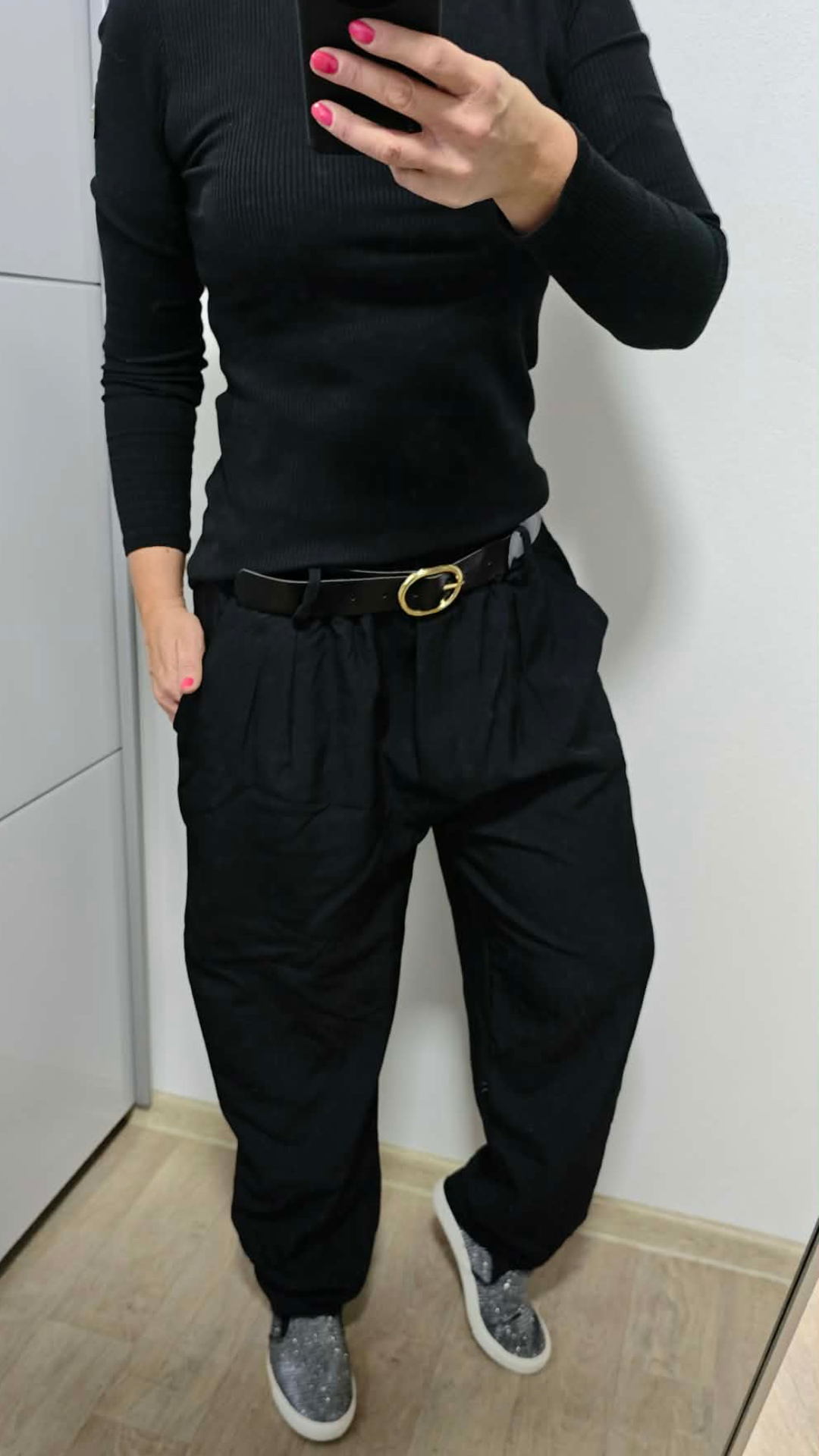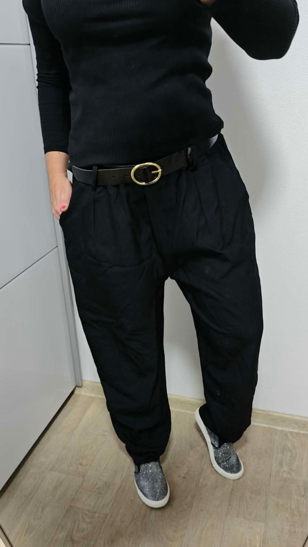 Elegantní černé kalhoty v moderním balónovém střihu, které spojují pohodlí a styl v jednom kousku. Díky volnějšímu střihu skvěle sedí na postavě, lichotí křivkám a zároveň poskytují maximální komfort při nošení. Součástí kalhot je i pásek, který krásně zvýrazní pas.