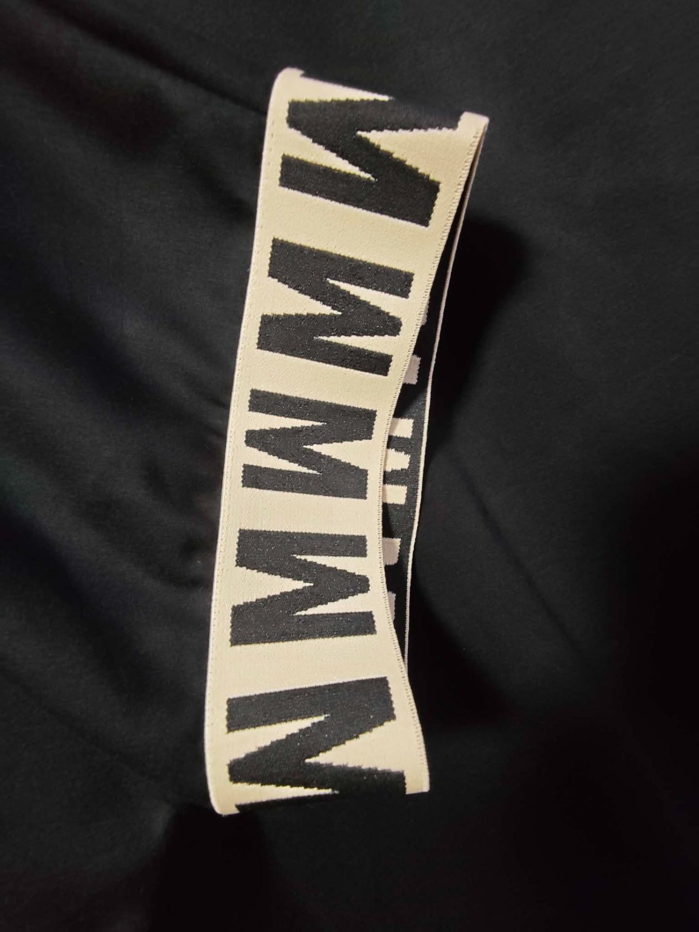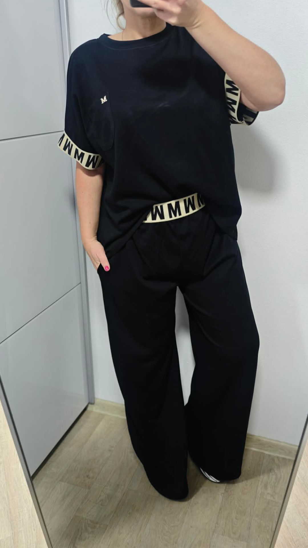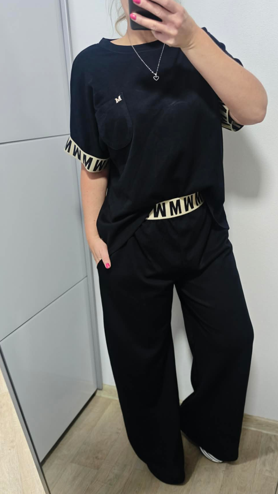 Tričko je volnějšího střihu. Rukávy jsou zakončené dekorativní gumou a nechybí stylová kapsička se zlatým "M", která krásně ladí s kalhotami.