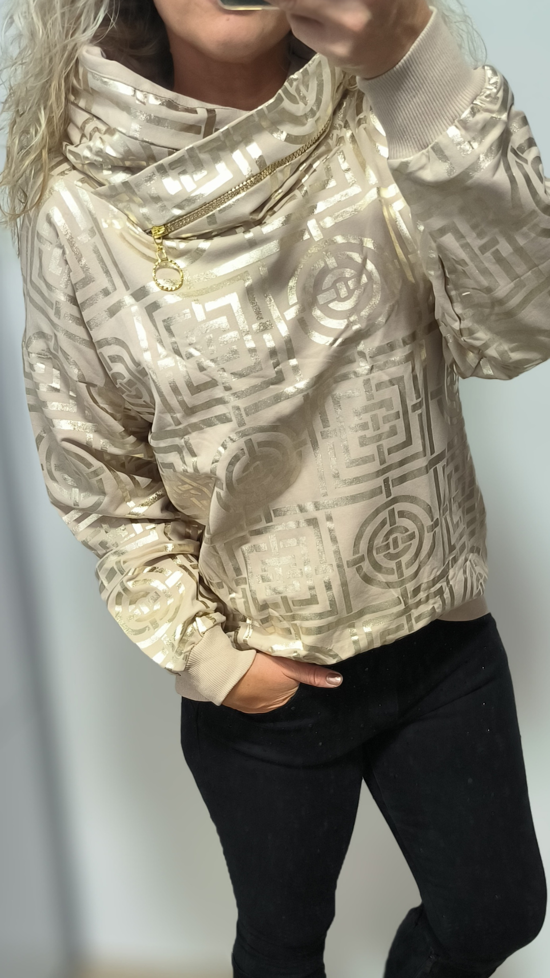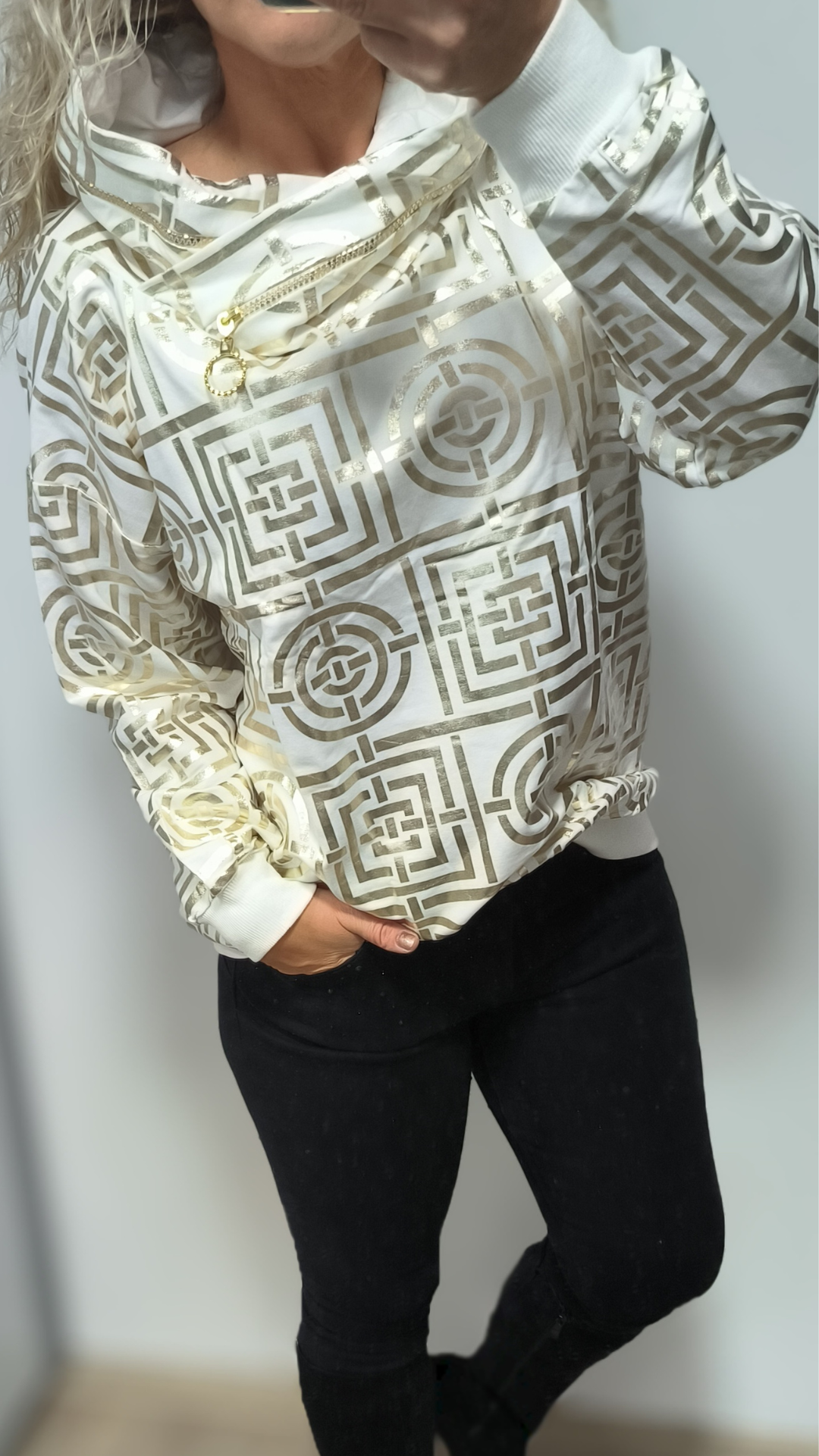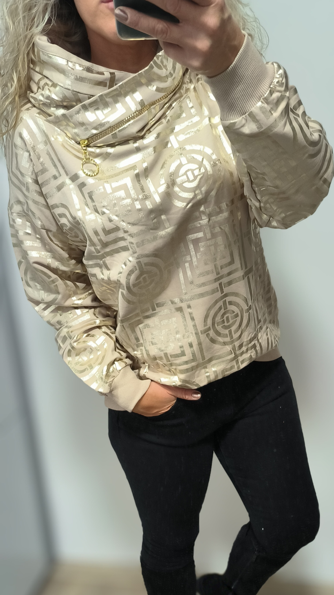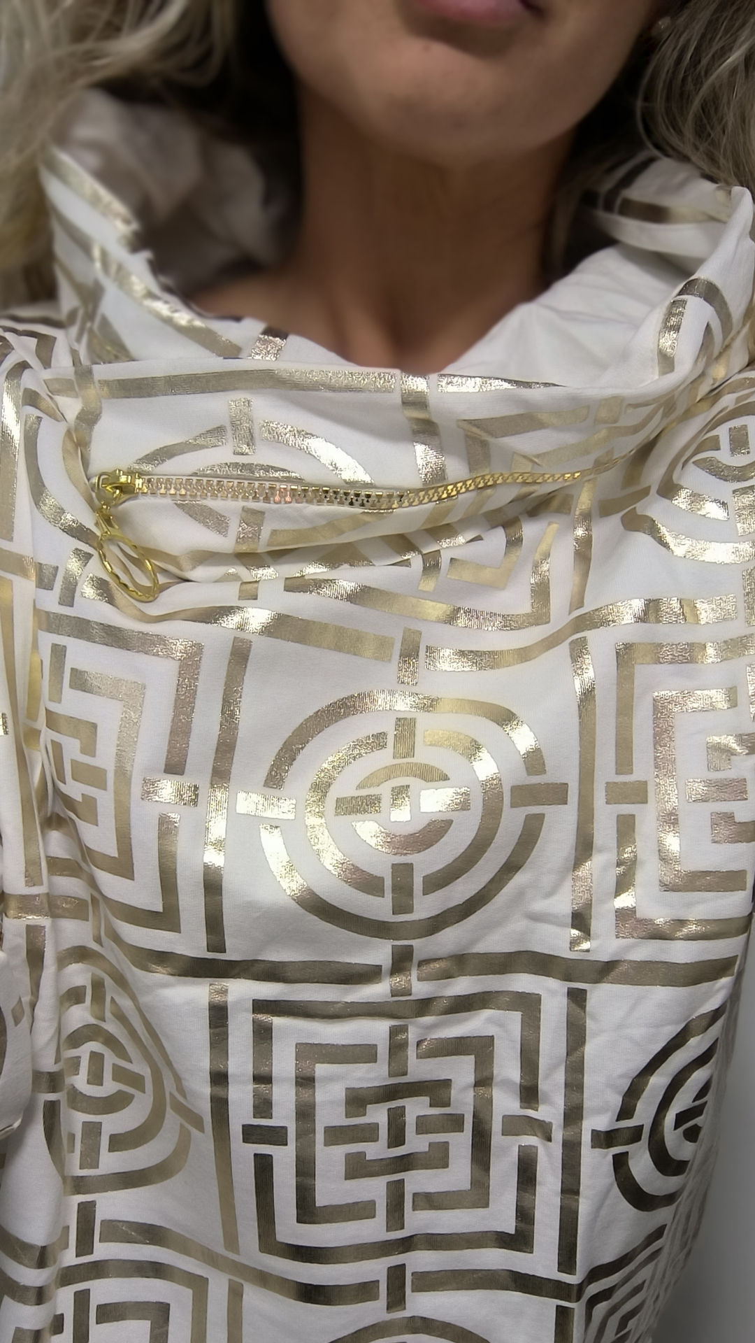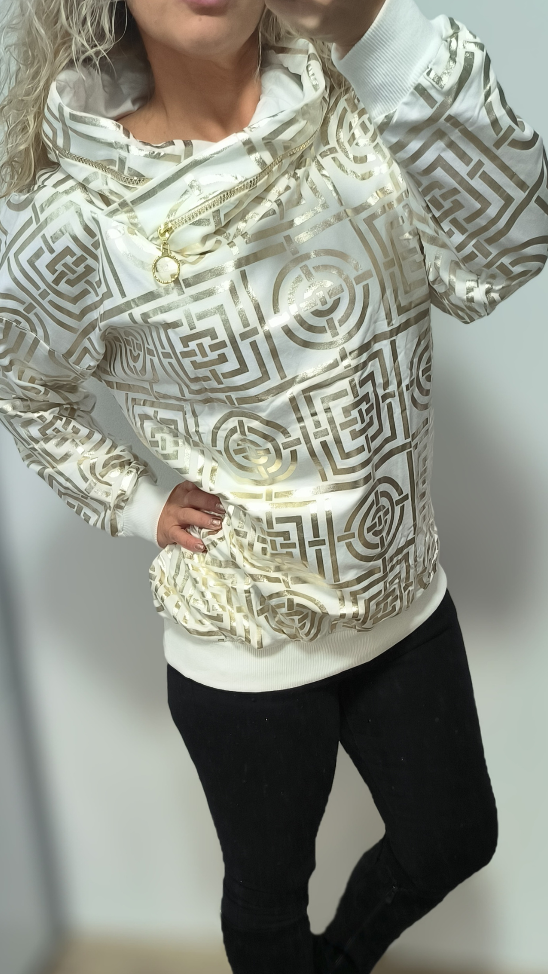 Dostupná ve třech barvách – bílá, černá a světle hnědá, které se snadno kombinují s čímkoliv ve vašem šatníku. Zaujme na první pohled: zlatý potisk a dekorativní zlatý zip na velkém límci dodávají mikině elegantní lesk.