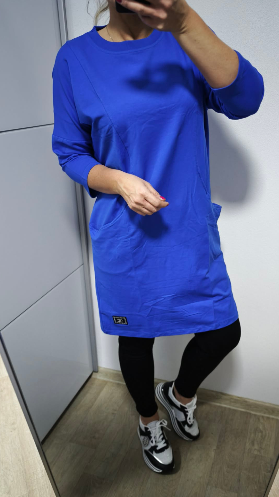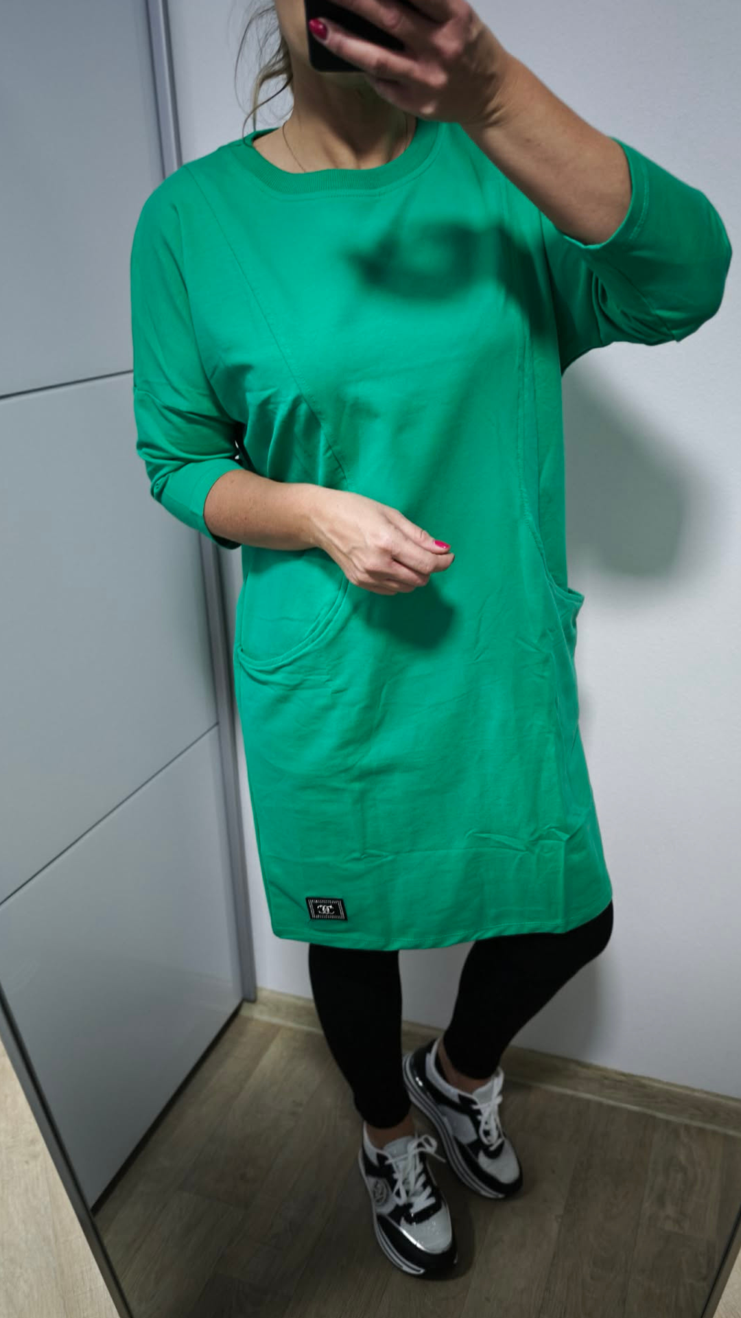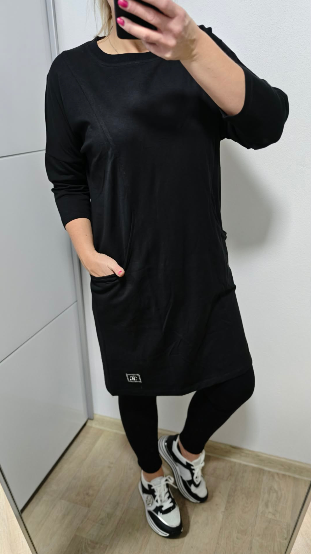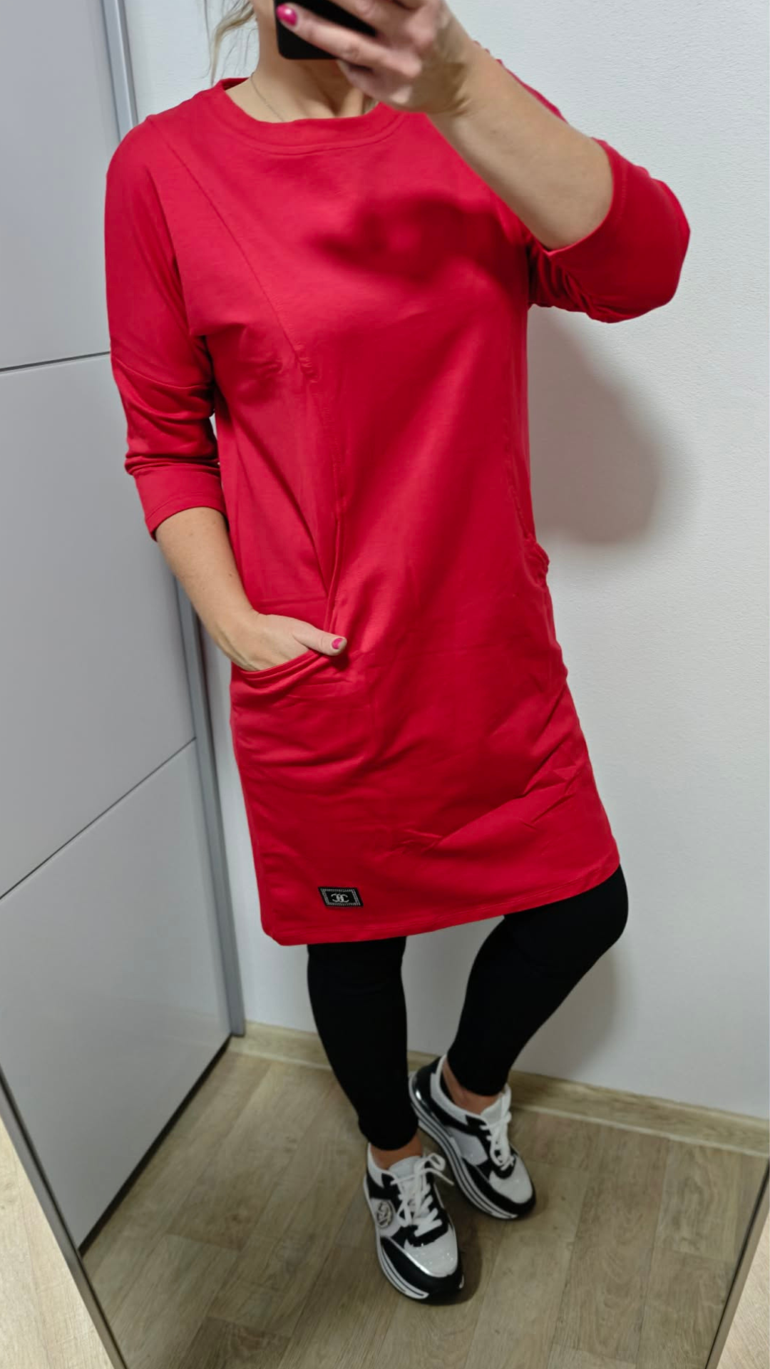 Dostupná ve více barvách – černá, červená, zelená a modrá – takže si snadno vybereš podle svého stylu. Mikina má praktické kapsy, 3/4 rukávy a decentní detail v podobě malého štítku se stříbrnými kamínky, který dodává outfitu šmrnc.