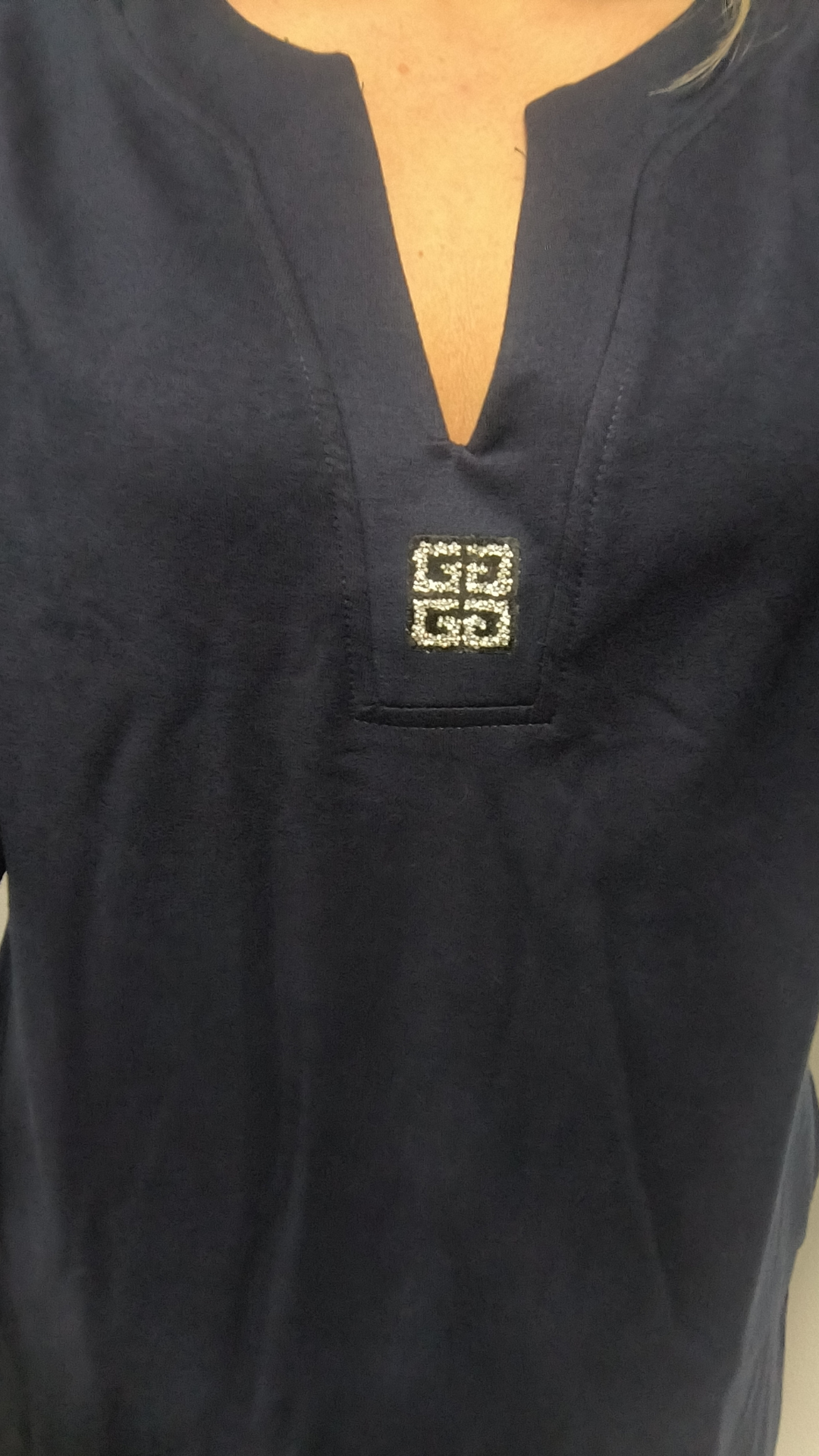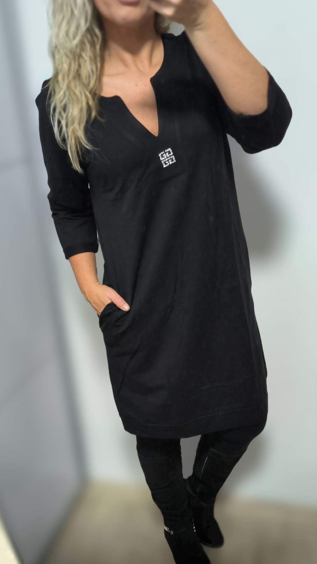 Pohodlné, stylové a zároveň elegantní – přesně takové jsou naše mikinové šaty / dlouhá mikina v krásné černé a tmavě modré barvě. Díky 3/4 rukávům, výstřihu do V a efektní aplikaci ze stříbrných kamínků působí šaty moderně a šik, ale stále si zachovávají komfort typický pro mikinový styl.