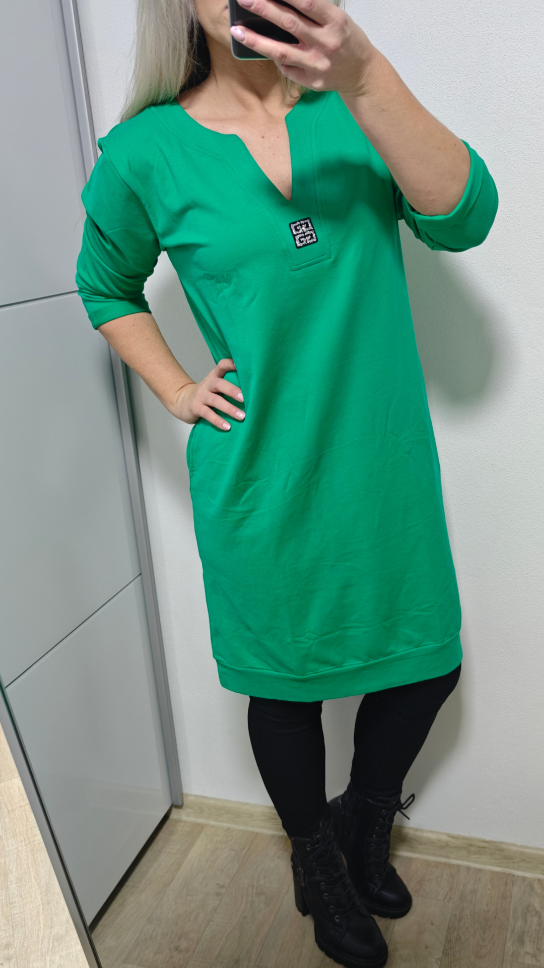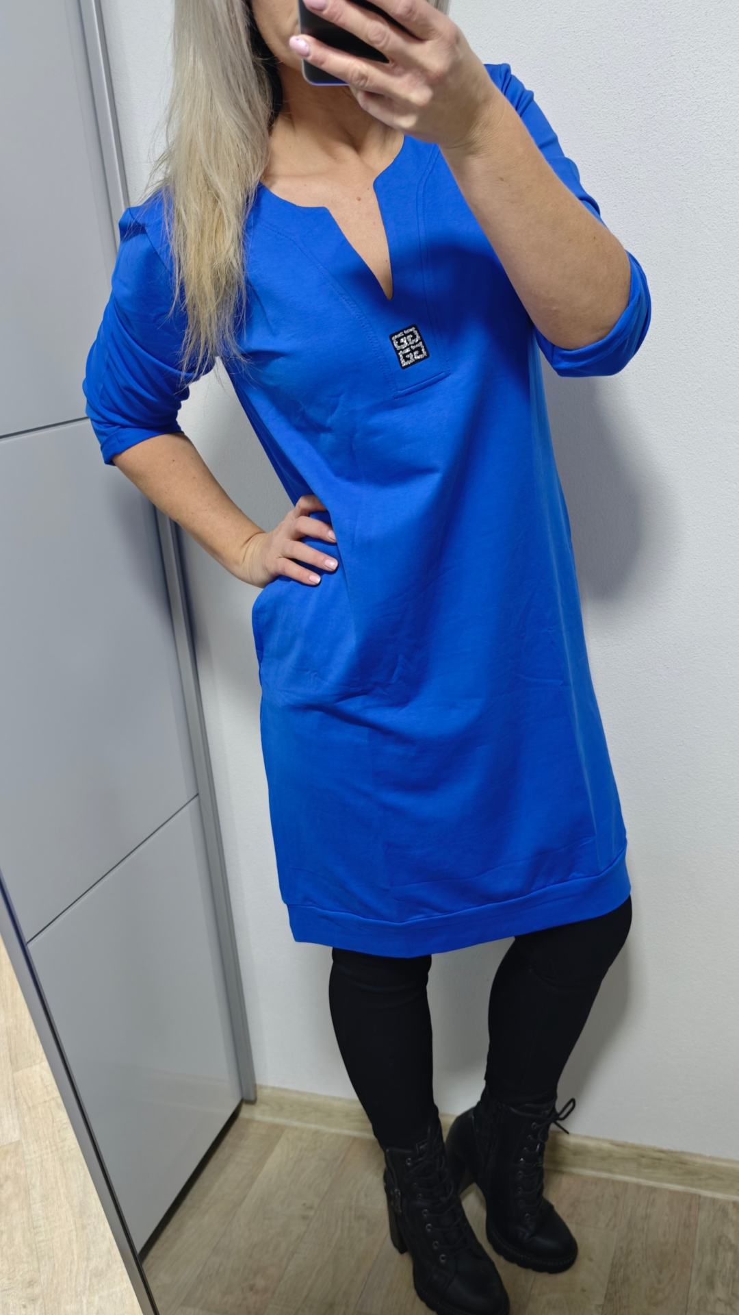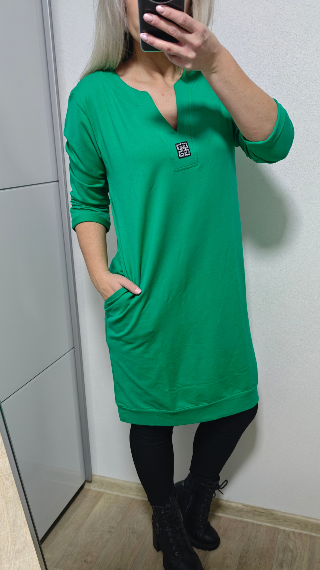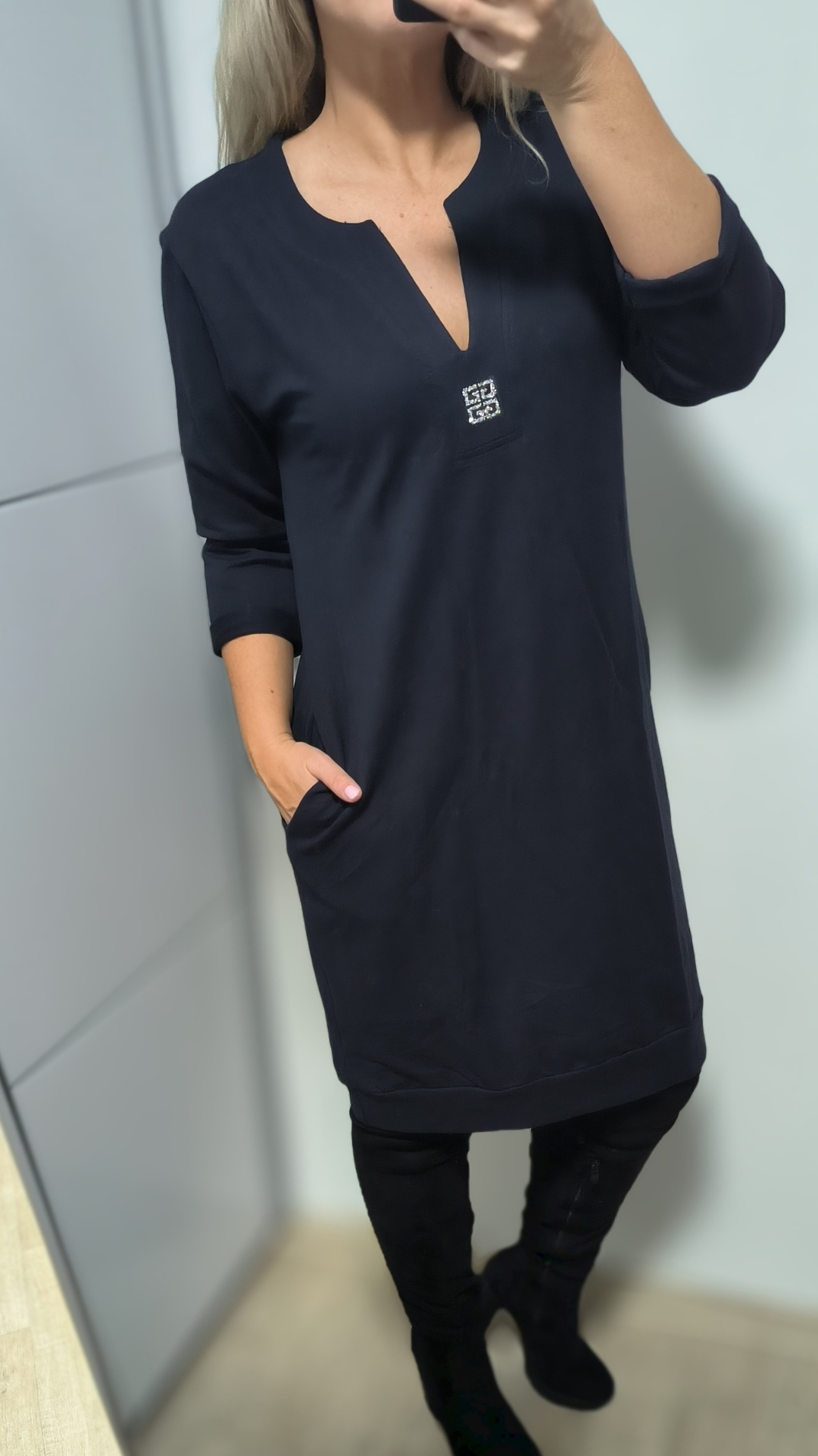 Pohodlné, stylové a zároveň elegantní – přesně takové jsou naše mikinové šaty / dlouhá mikina v krásné černé, tmavě modré, růžové, modré a zelené barvě. Díky 3/4 rukávům, výstřihu do V a efektní aplikaci ze stříbrných kamínků působí šaty moderně a šik, ale stále si zachovávají komfort typický pro mikinový styl.