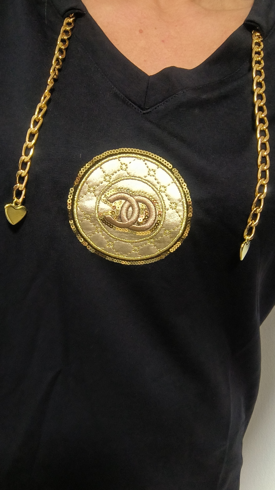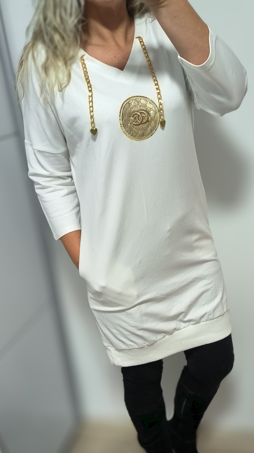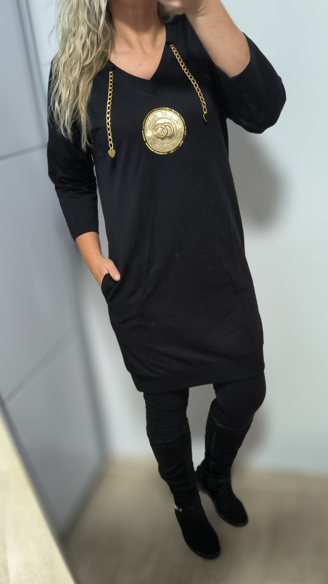 Měkký, příjemný materiál a volnější střih se postarají o maximální pohodlí, zatímco detaily jako výstřih do V, vyšité logo s flitry a zlatý řetízek se srdíčky na koncích dodávají šatům luxusní a originální vzhled.