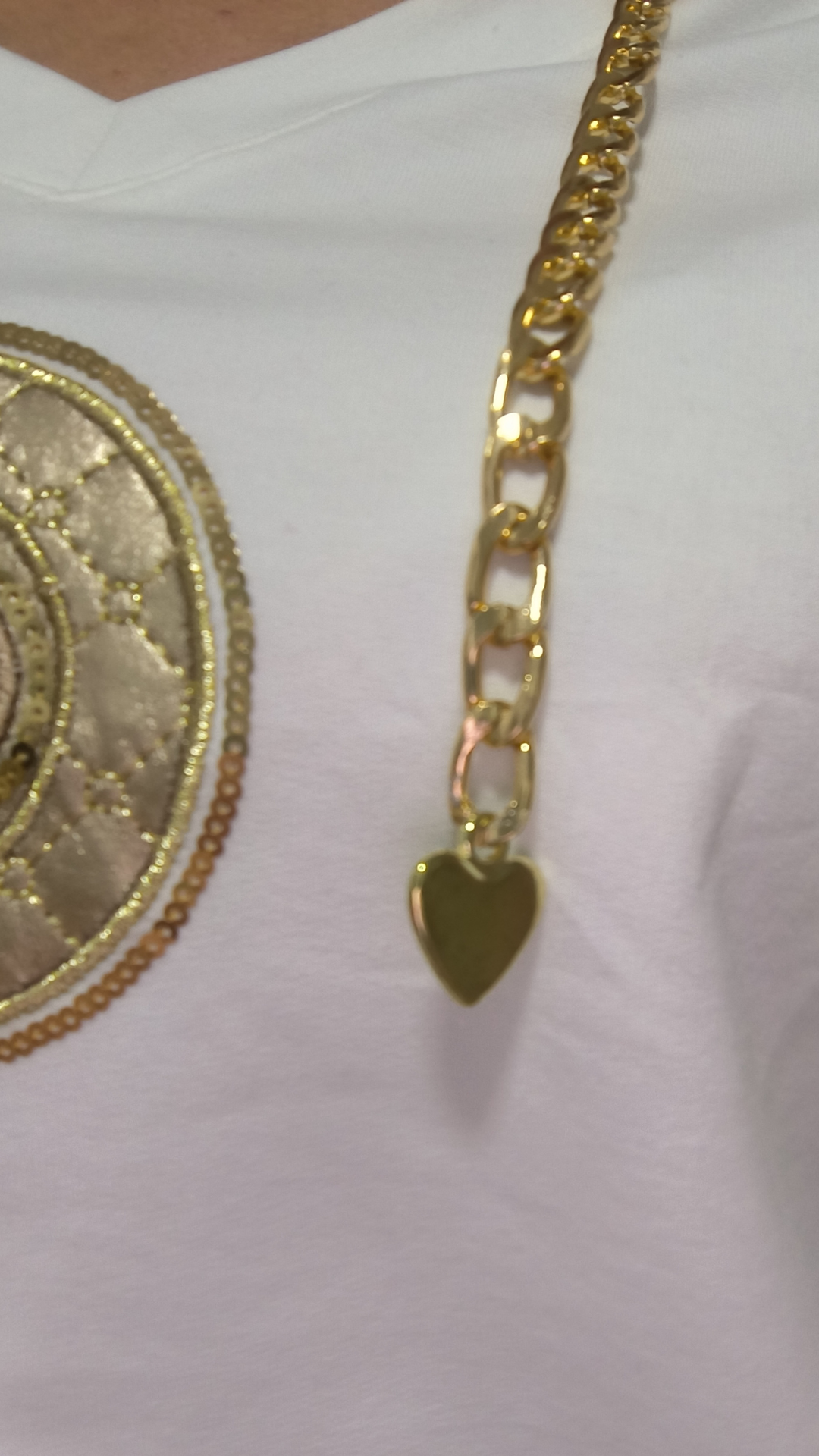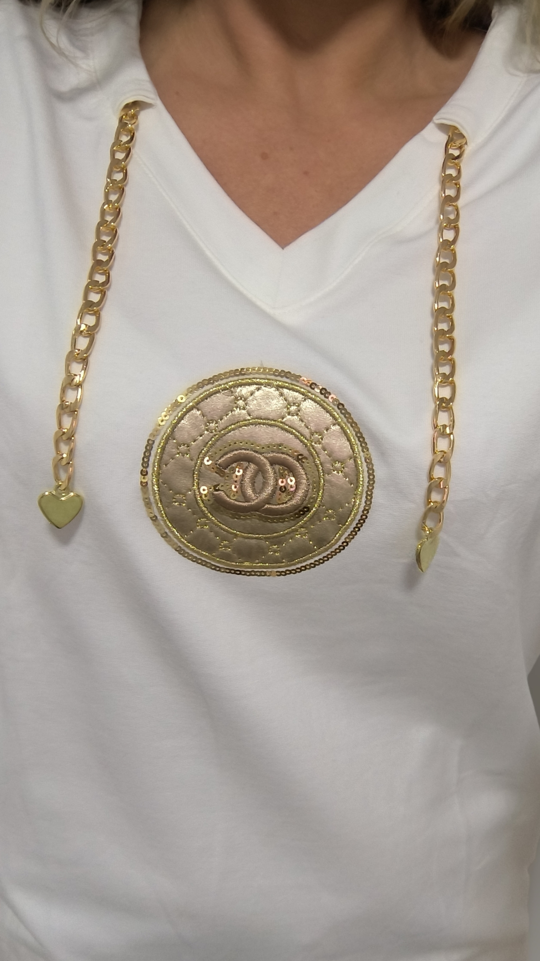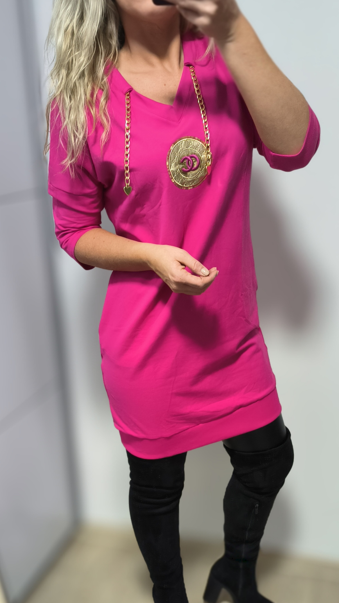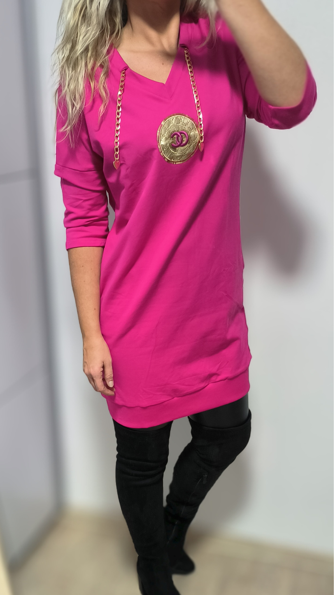 Měkký, příjemný materiál a volnější střih se postarají o maximální pohodlí, zatímco detaily jako výstřih do V, vyšité logo s flitry a zlatý řetízek se srdíčky na koncích dodávají šatům luxusní a originální vzhled.