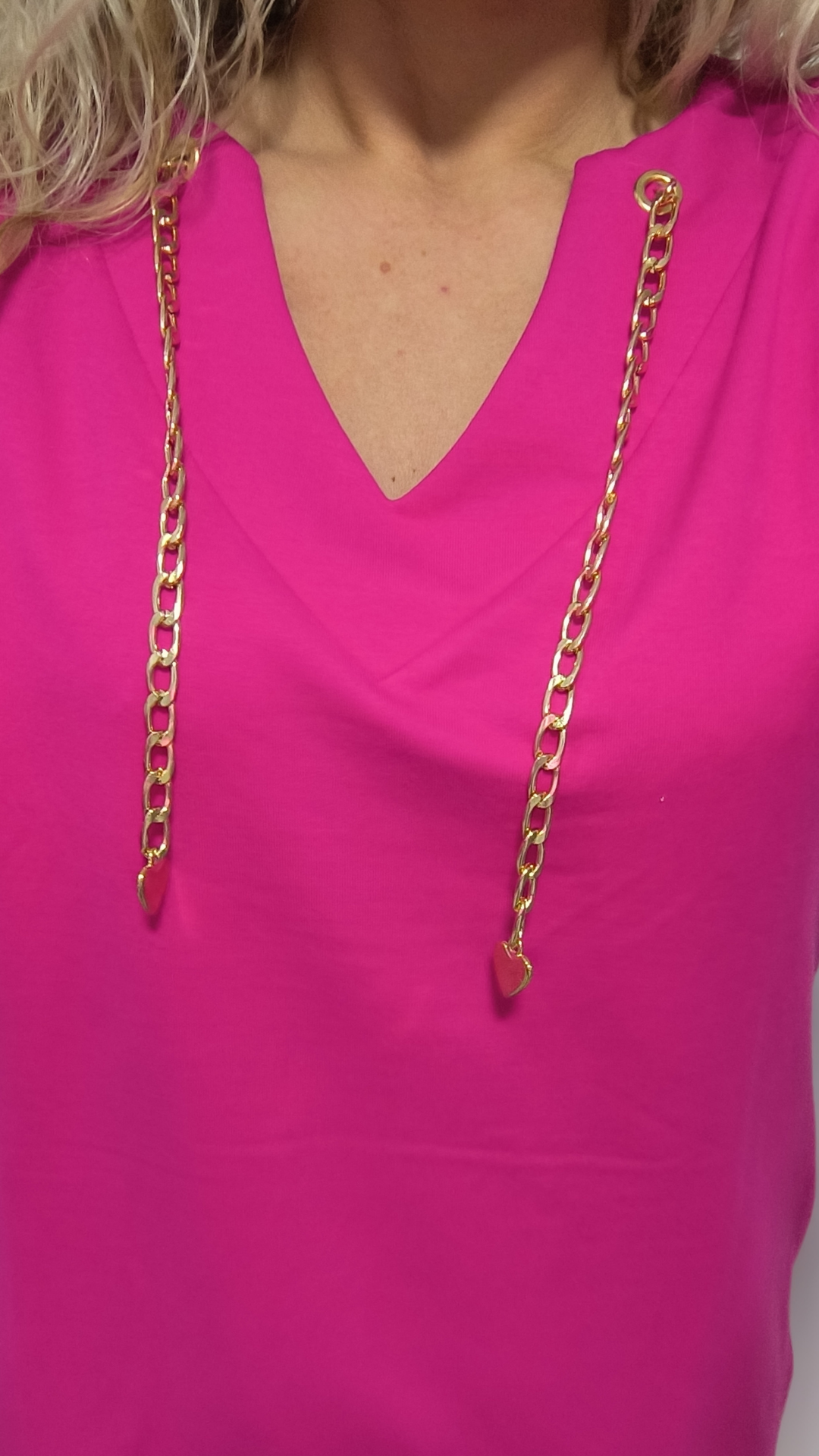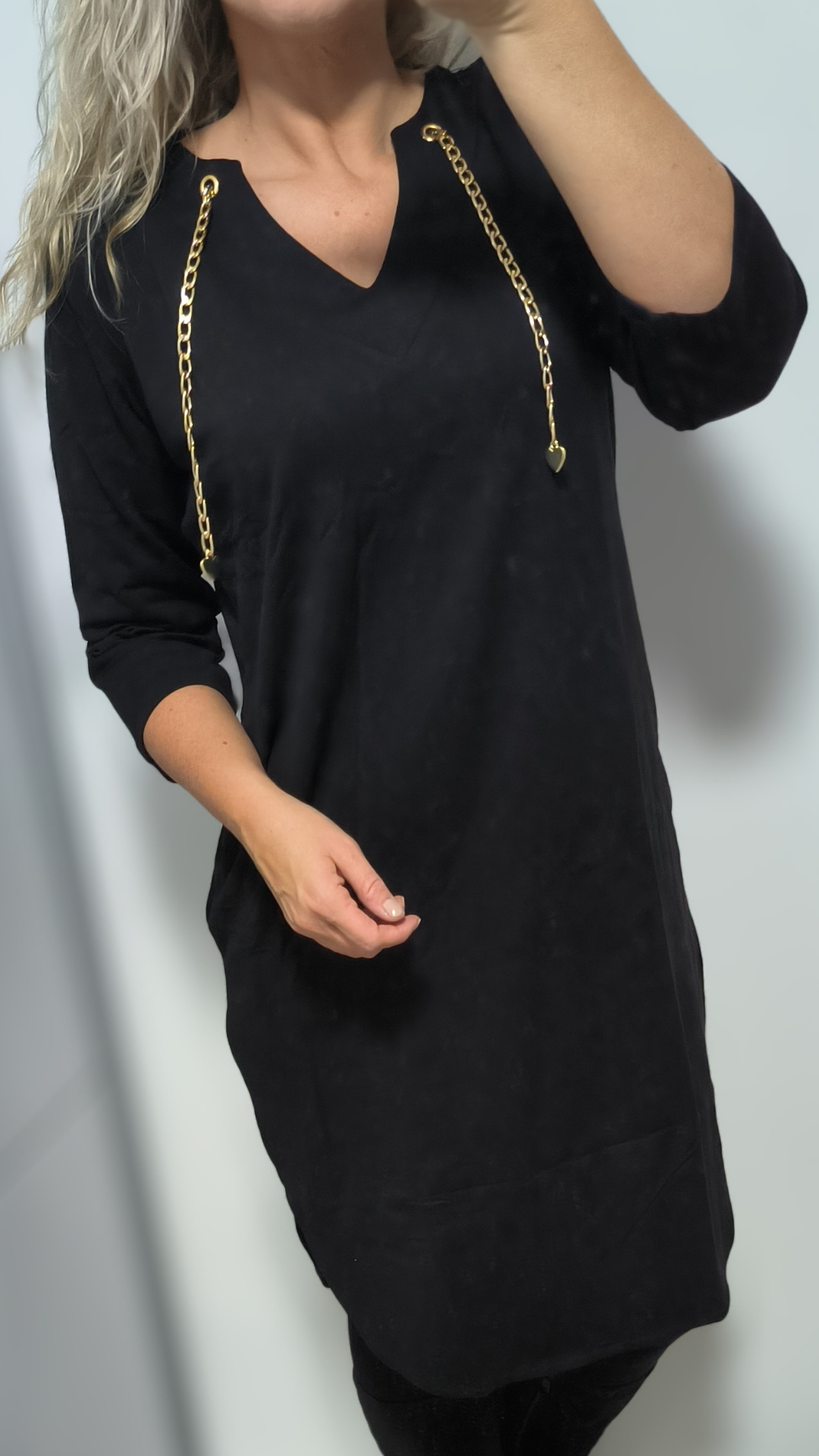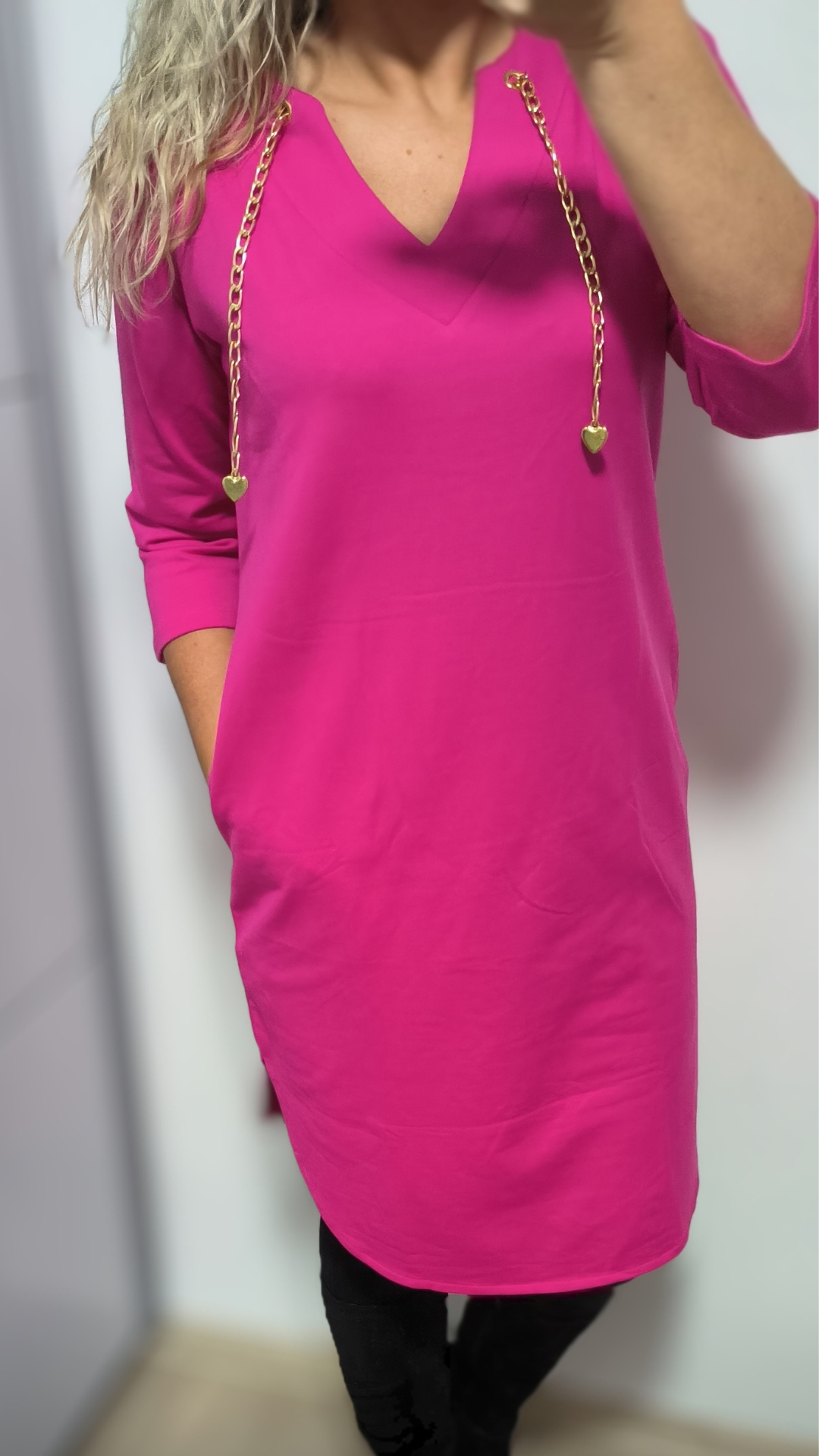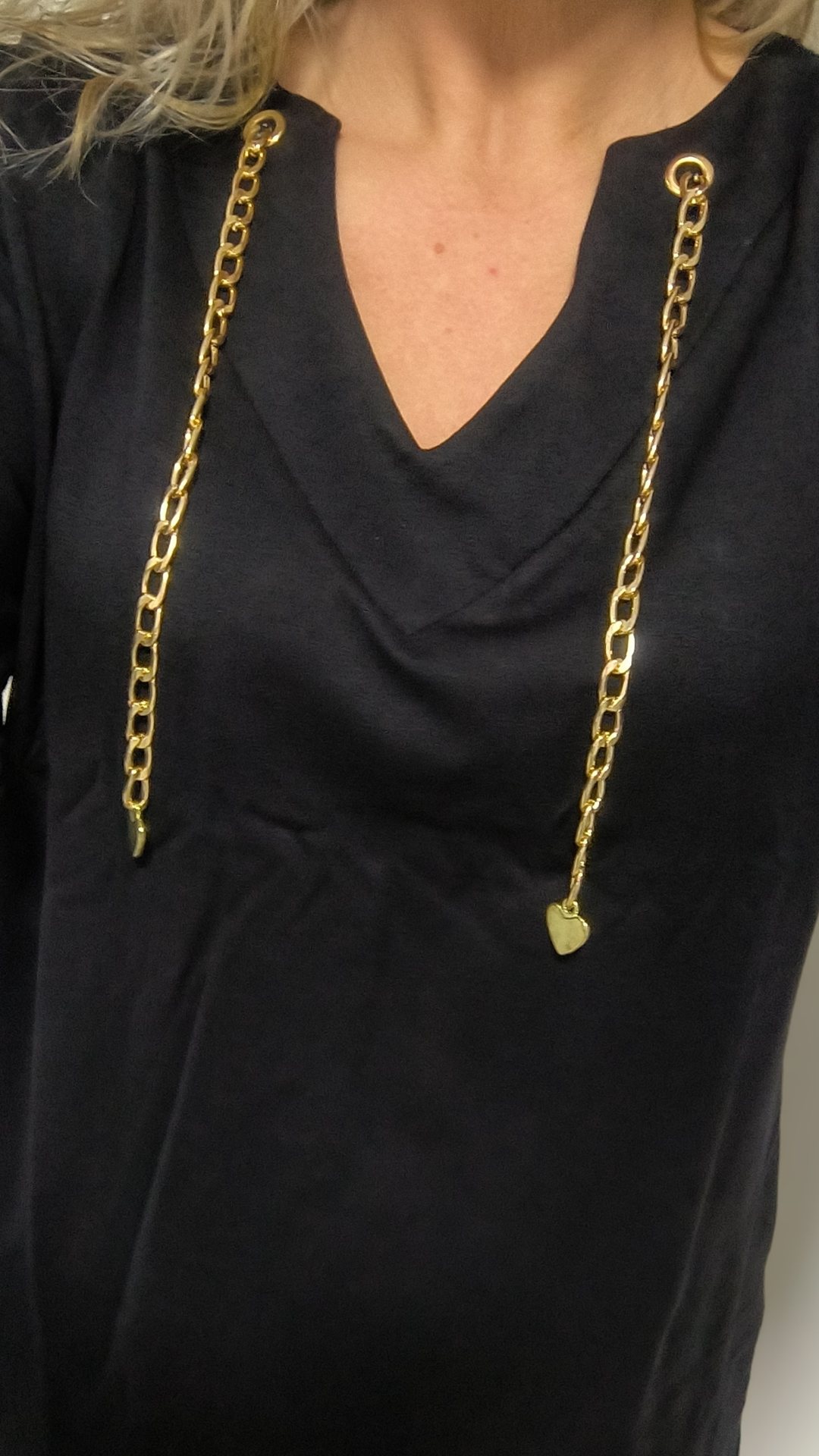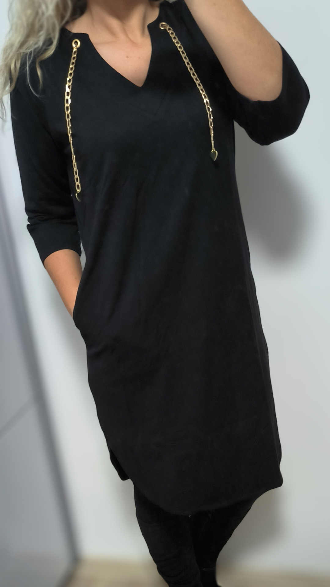 Zaujme výstřihem do V, jemným zlatým řetízkem, který je zakončen srdíčkem a praktickými kapsami po stranách.
