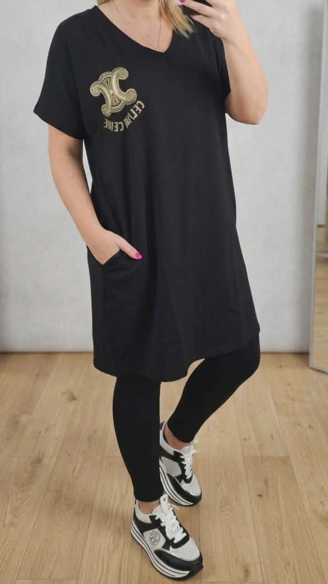 Stylové dámské šaty ve střihu dlouhého trička v elegantní černé barvě, které spojují pohodlí a výrazný detail. Potisk doplněný o zlaté kamínky Celnie dodává modelu luxusní nádech a dělá z něj nepřehlédnutelný kousek.