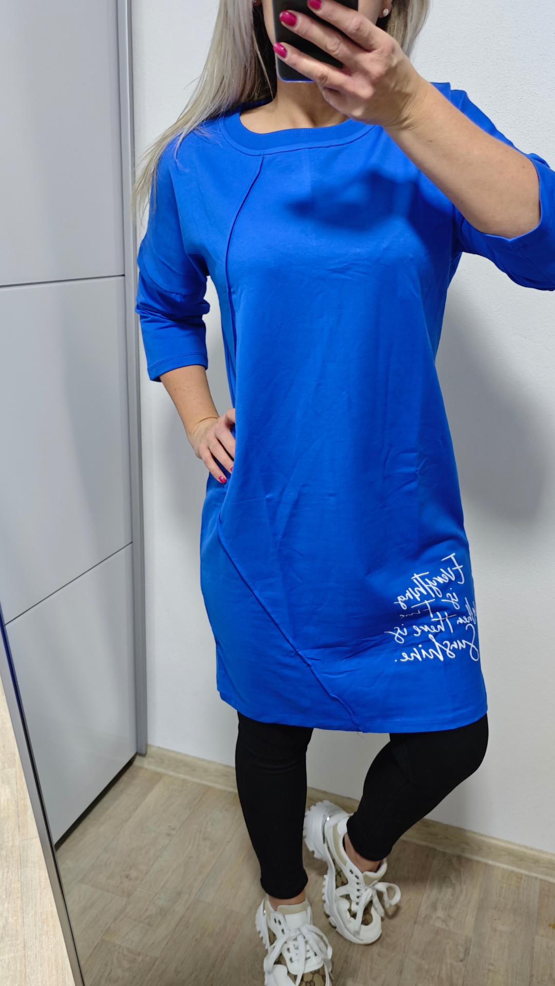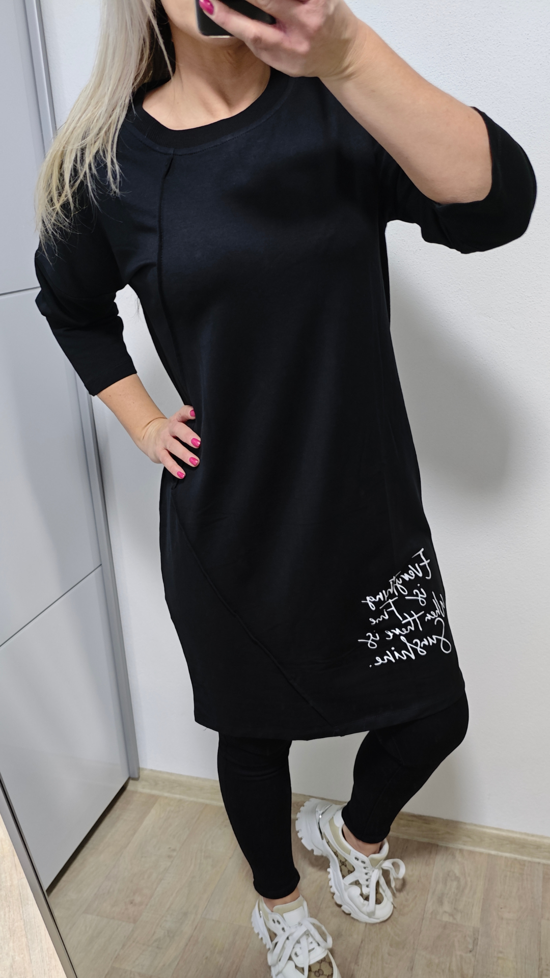 Díky příjemnému bavlněnému materiálu s elastanem jsou šaty pružné, pohodlné a krásně se přizpůsobí postavě. 3/4 rukávy dodávají praktický rozměr – ideální na celoroční nošení. Nosit je můžete jako šaty i jako delší mikinu k legínám.