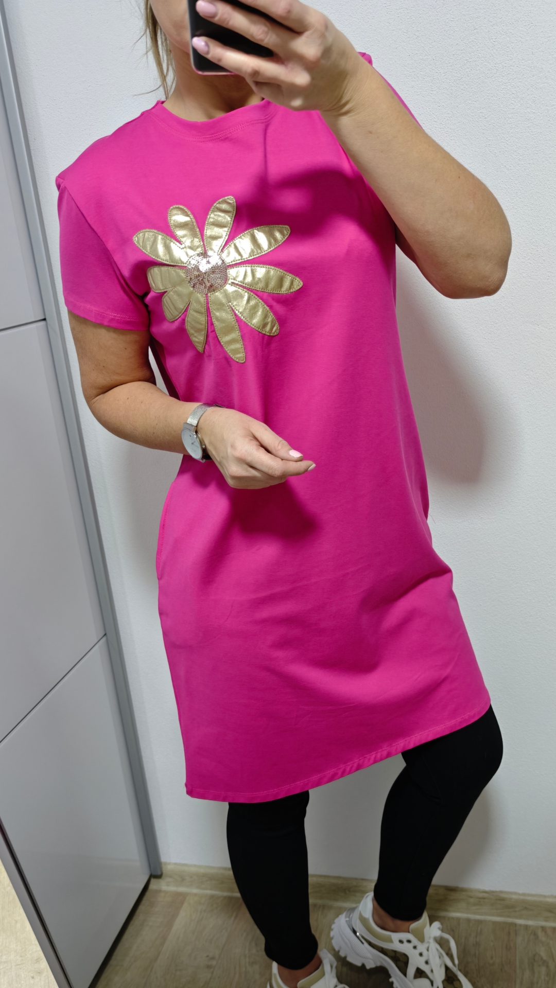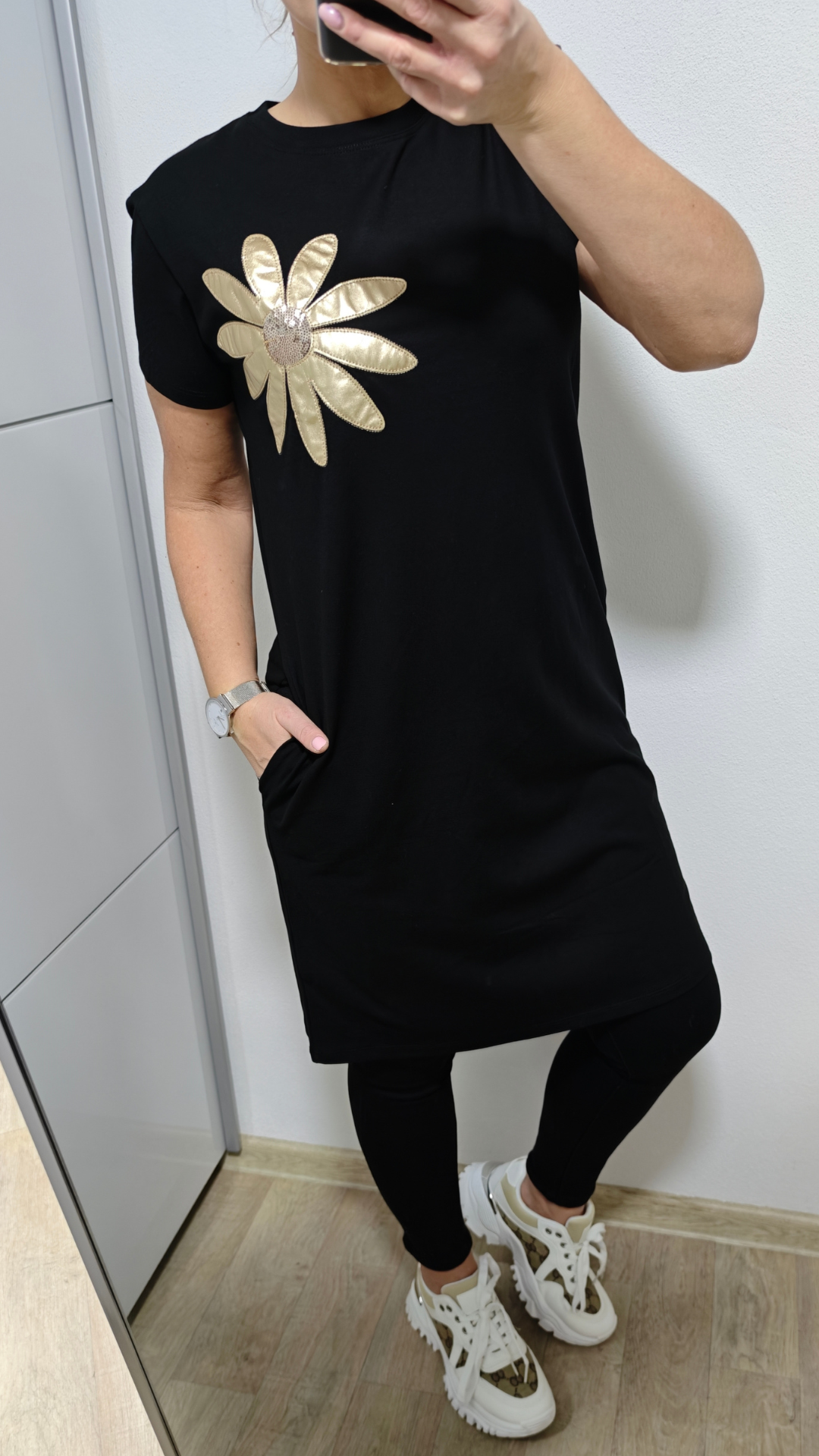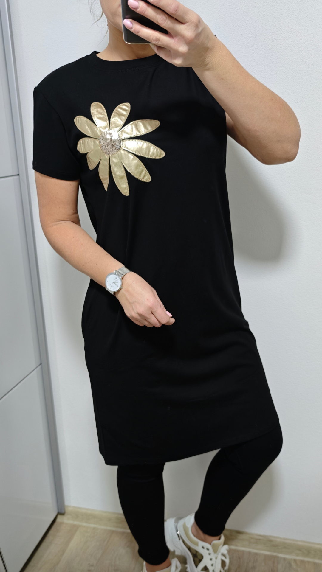 Šaty KORÉLIA si zamilujete na první obléknutí. Stylový střih doplňuje vyšitá zlatá květina s flitry, která dodává modelu luxusní nádech. Praktické kapsy zajišťují maximální pohodlí a ležérní šmrnc.