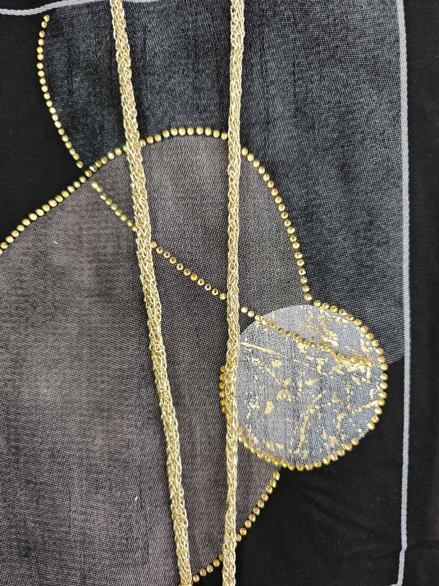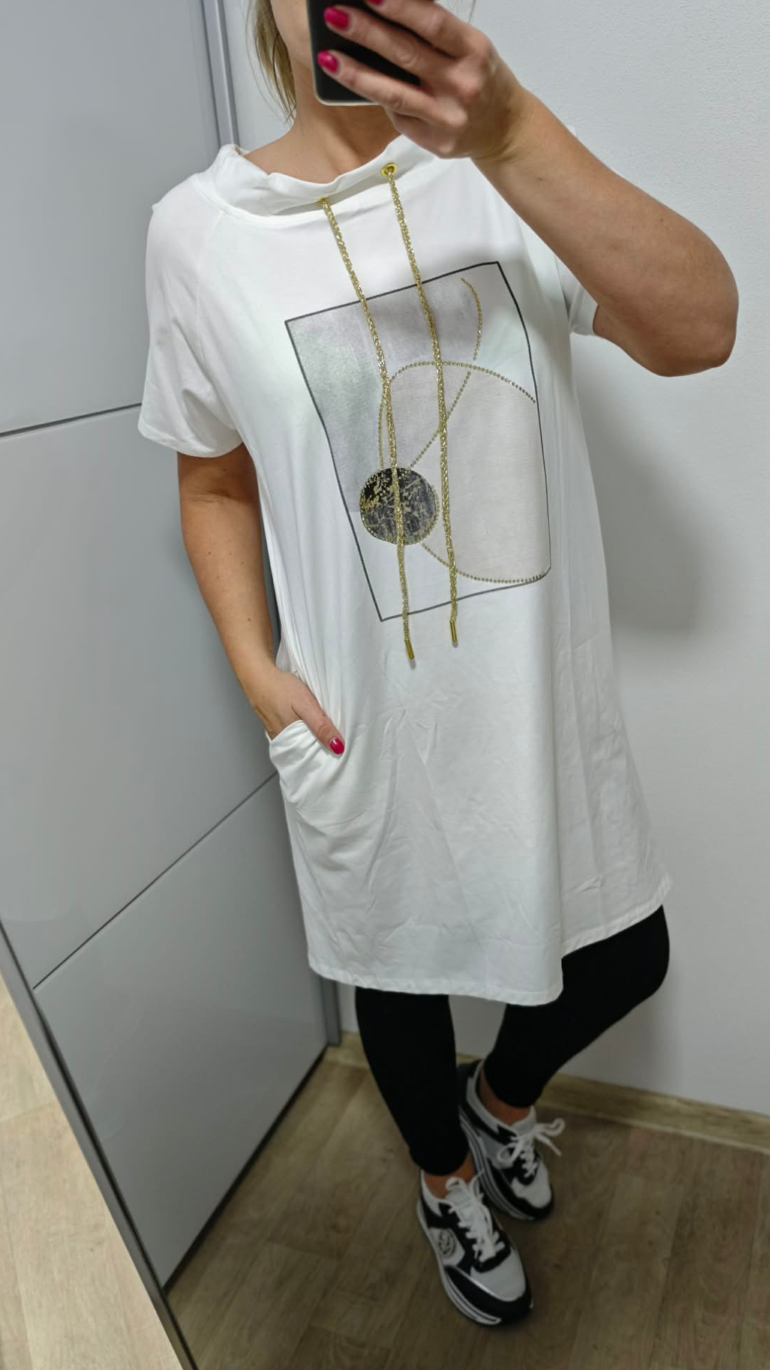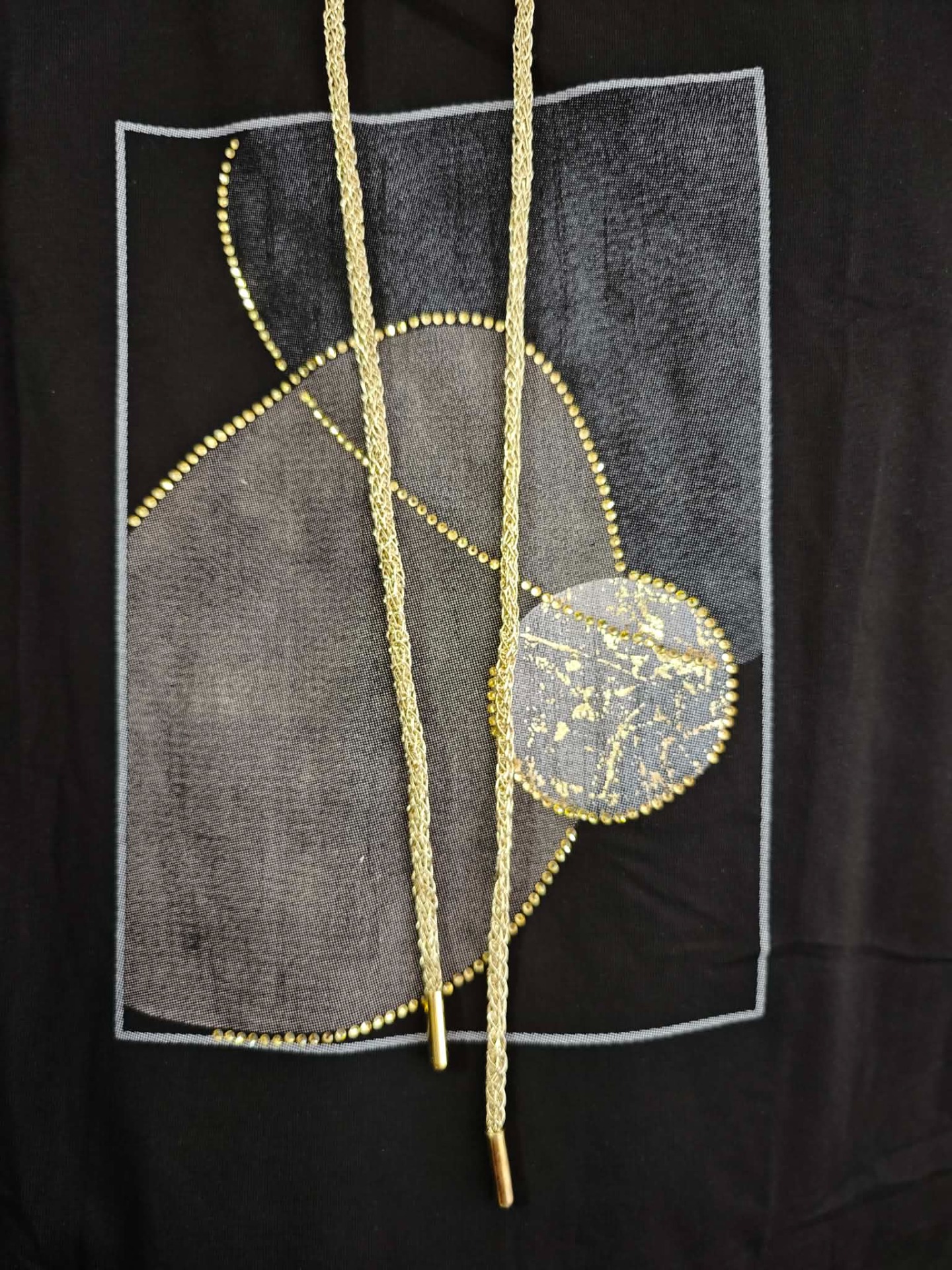 Dostupný v černé nebo bílé variantě, doplněný o efektní potisk se zlatými kamínky a stylové zlaté tkaničky, které dodávají outfitu luxusní nádech. Praktické kapsy jsou nejen trendy, ale i funkční – přesně to, co dnes ženy chtějí.
