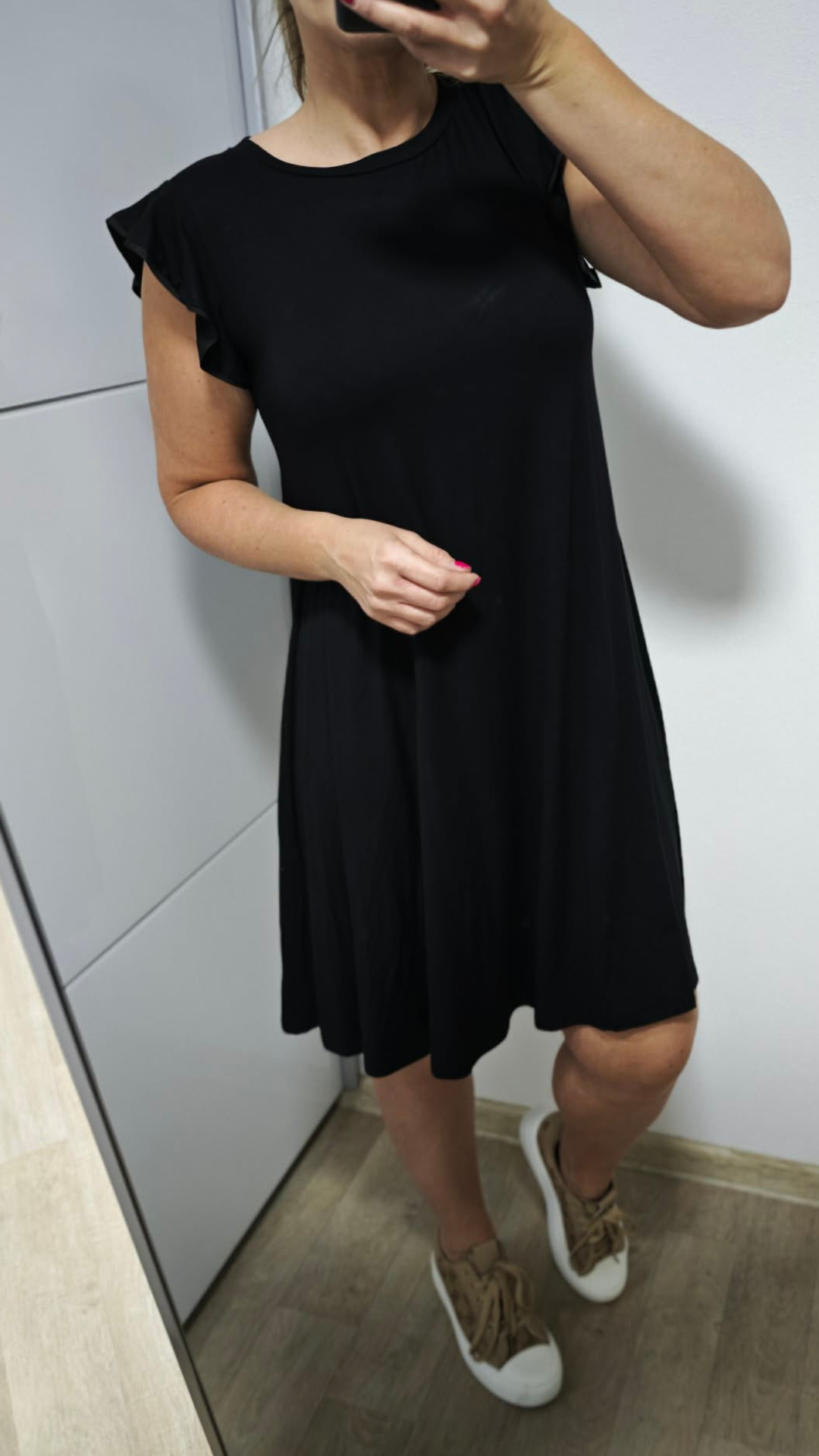 Černé šaty, které si zamiluješ na první obléknutí. Střih do A krásně tvaruje postavu, zakryje to, co má.. Elegantní volánky na rukávech dodávají šatům jemnost a šmrnc, díky kterému vynikneš v každé situaci.