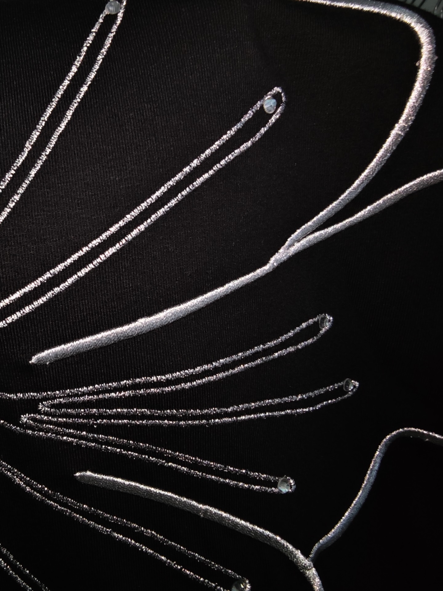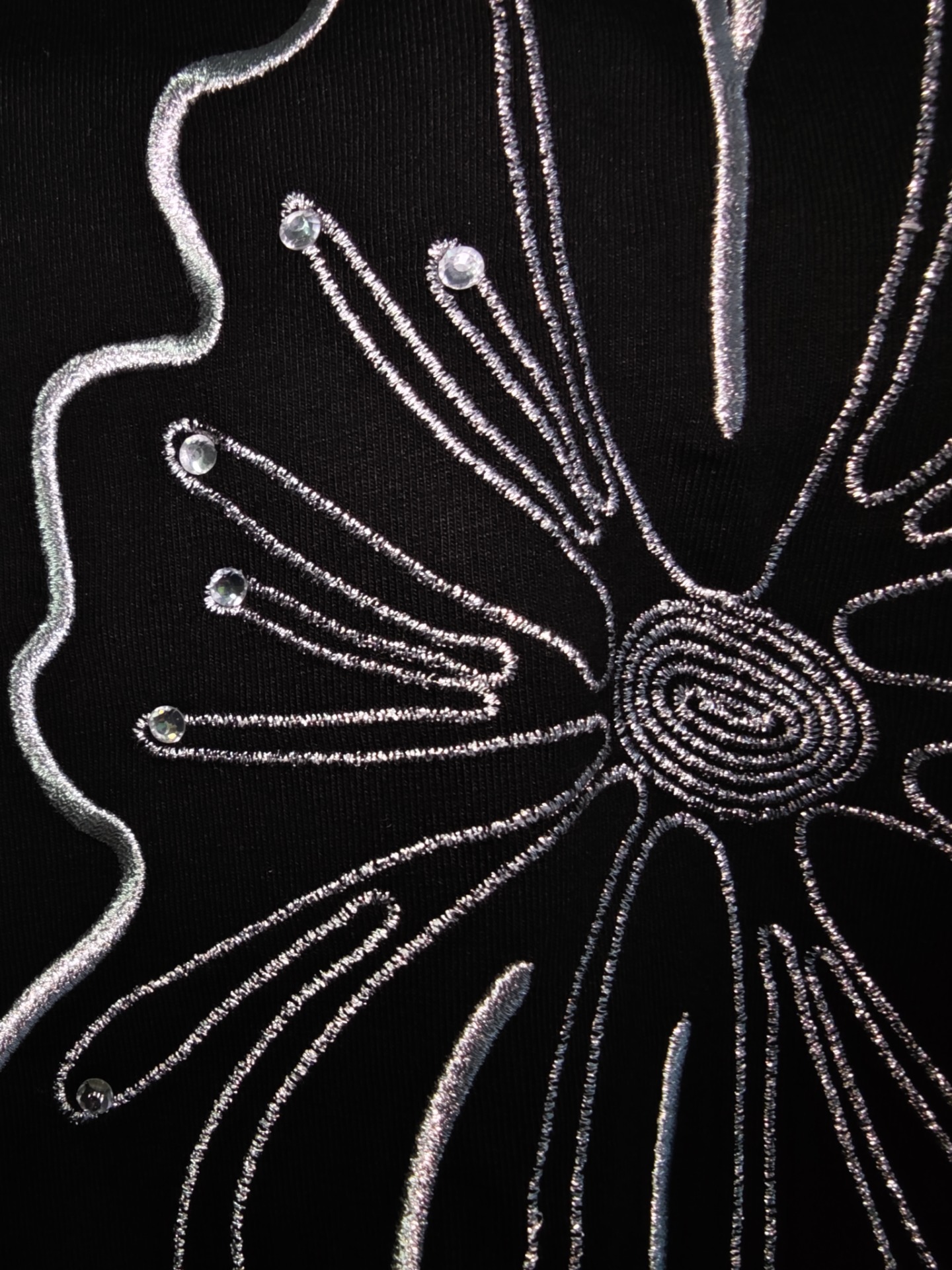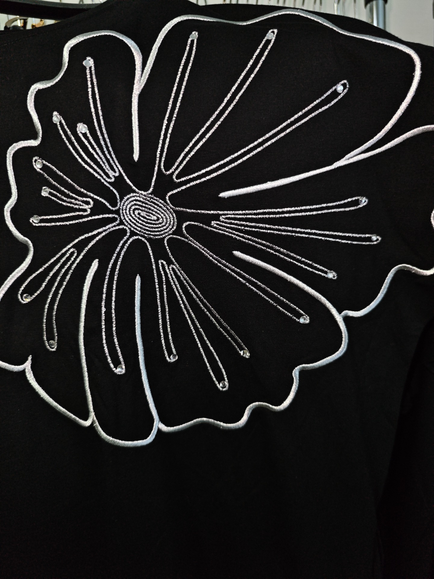 Pohodlné a stylové dámské šaty / dlouhé tričko Silvara jsou ideální volbou pro ženy, které chtějí spojit komfort s moderním vzhledem. Černý základ doplňuje stříbrná vyšívaná květina se stříbrnými kamínky, která dodává modelu elegantní a jemně třpytivý detail.