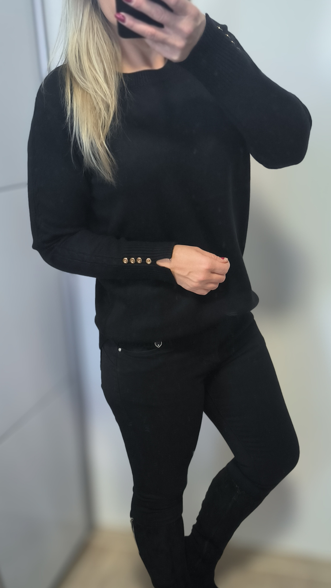 Moderní rozparky na rukávech spolu se zlatými aplikacemi na rukávech vytváří originální design, který zaujme na první pohled. Svetr má pohodlný, který krásně sedí a přizpůsobí se postavě.