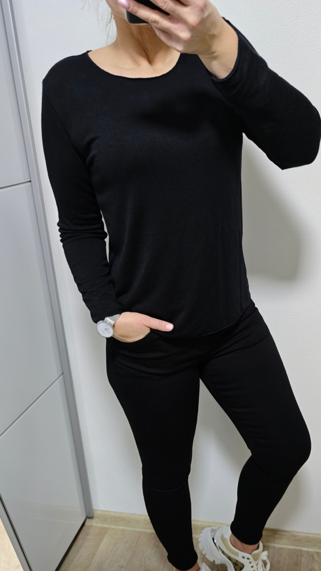 Lehký, příjemně pružný svetr / úpletové tričko s dlouhým rukávem, které si zamilujete na první obléknutí. Skvěle sedí, neobepíná zbytečně problematické partie a díky pružnému materiálu se krásně přizpůsobí postavě.