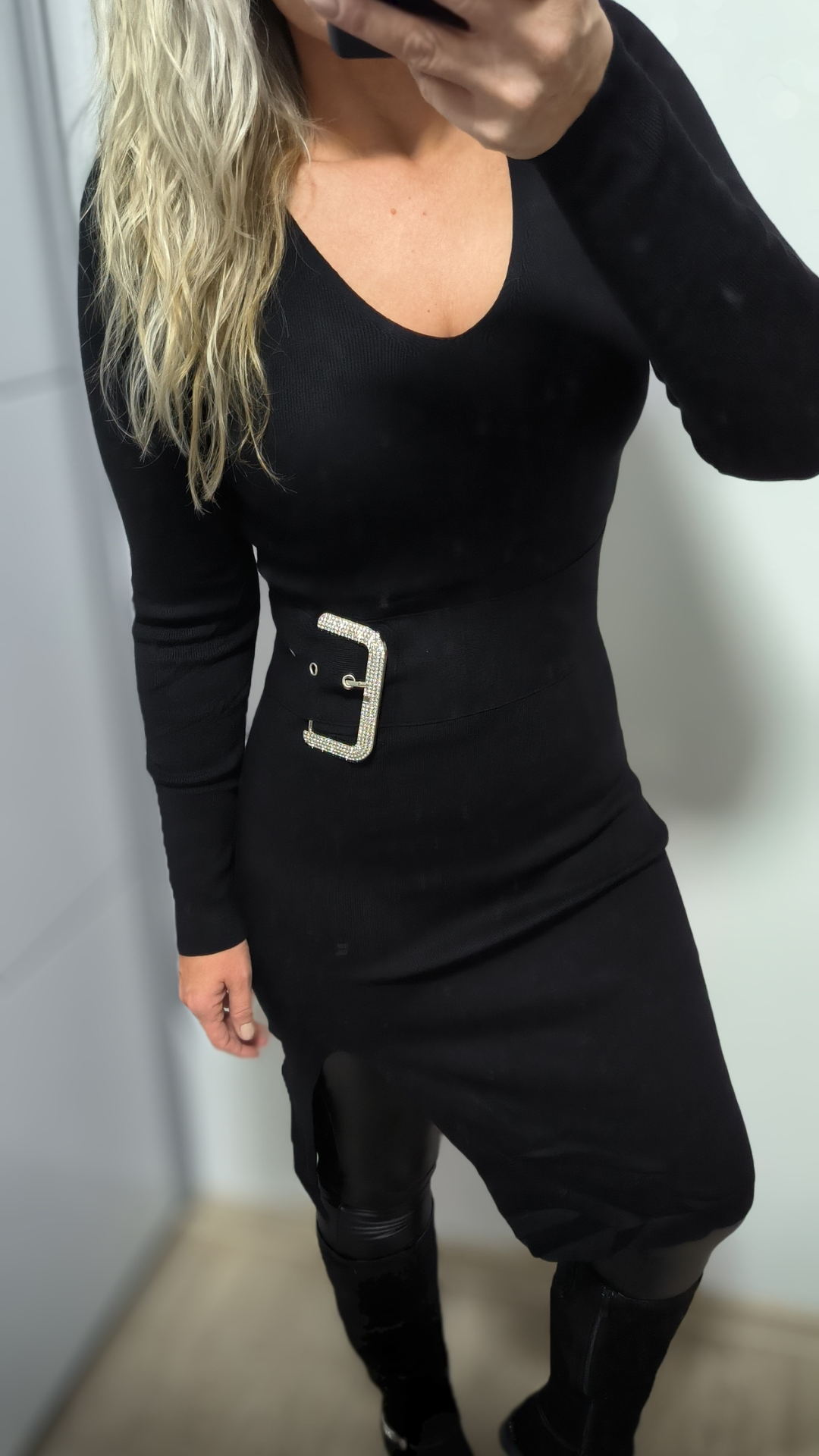 Objevte výjimečnou eleganci, která zaujme na první pohled. Svetrové šaty Adelina v černé barvě kombinují pohodlí pleteniny s luxusním detailem – ozdobnou přezkou zdobenou kamínky, která nádherně zvýrazní linii pasu.