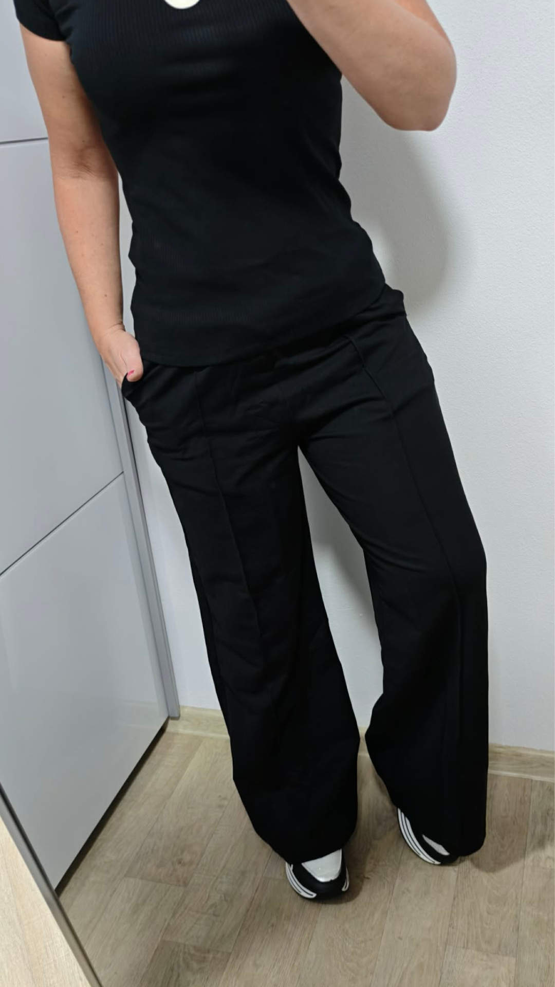 Stylové a maximálně pohodlné černé teplákové kalhoty, které si zamiluješ na první obléknutí. Mají vysoký pas s pružnou gumou, která se krásně přizpůsobí postavě a zároveň opticky zvýrazní siluetu díky modernímu "V" tvaru v pase.