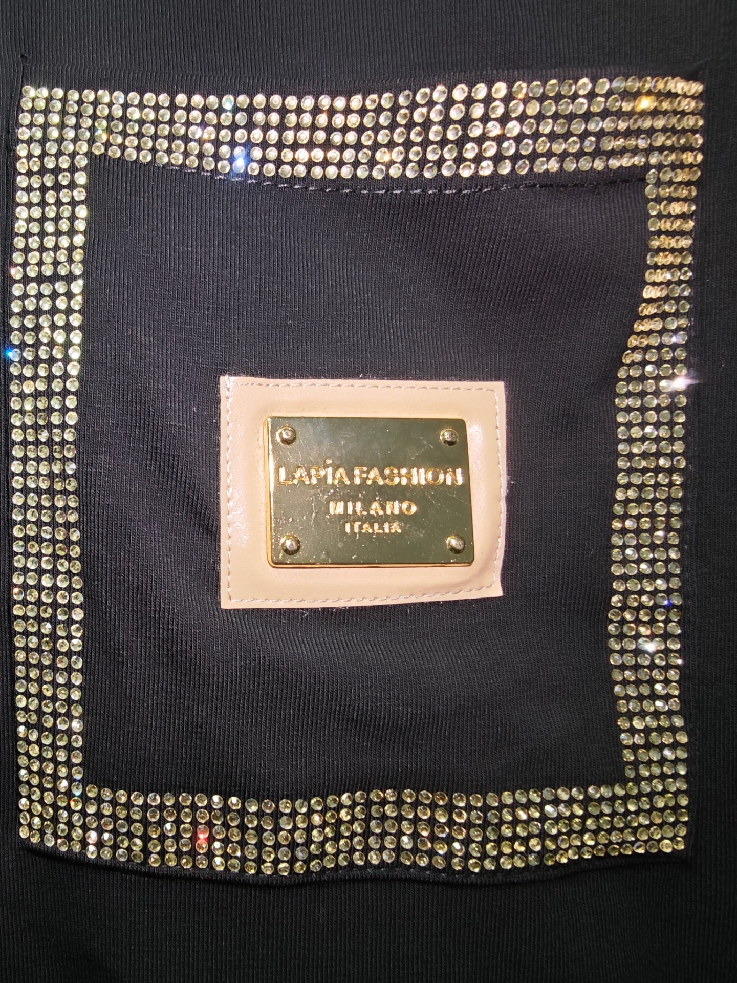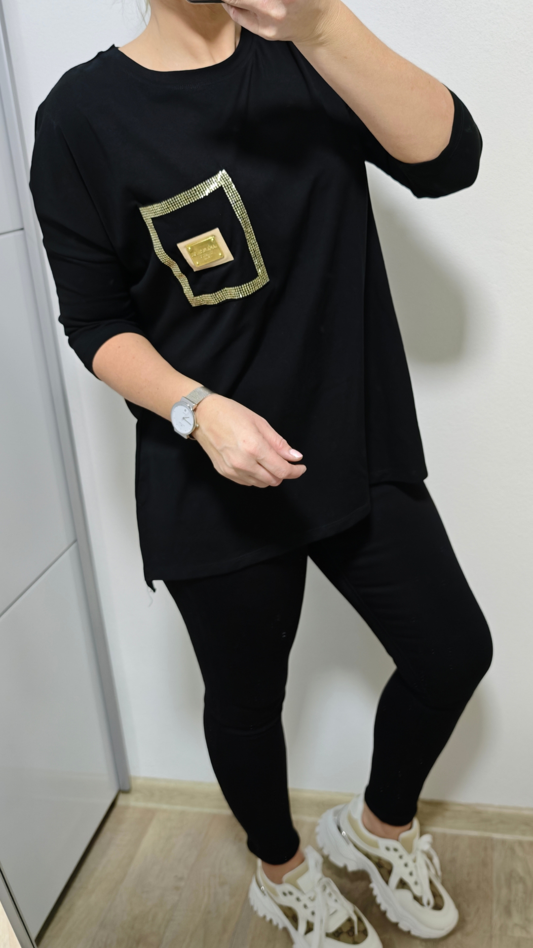 Stylové a pohodlné tričko Rena je ideální volbou pro ženy, které chtějí spojit komfort s jemným luxusním detailem. Černá barva působí elegantně a nadčasově, zatímco náprsní kapsa lemovaná zlatými kamínky a zlatý štítek uprostřed dodávají modelu originální a ženský vzhled.