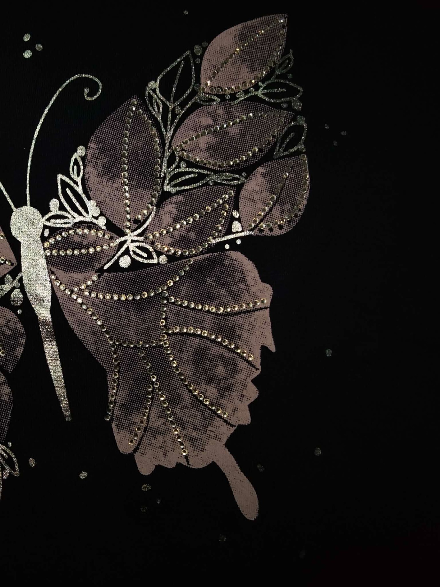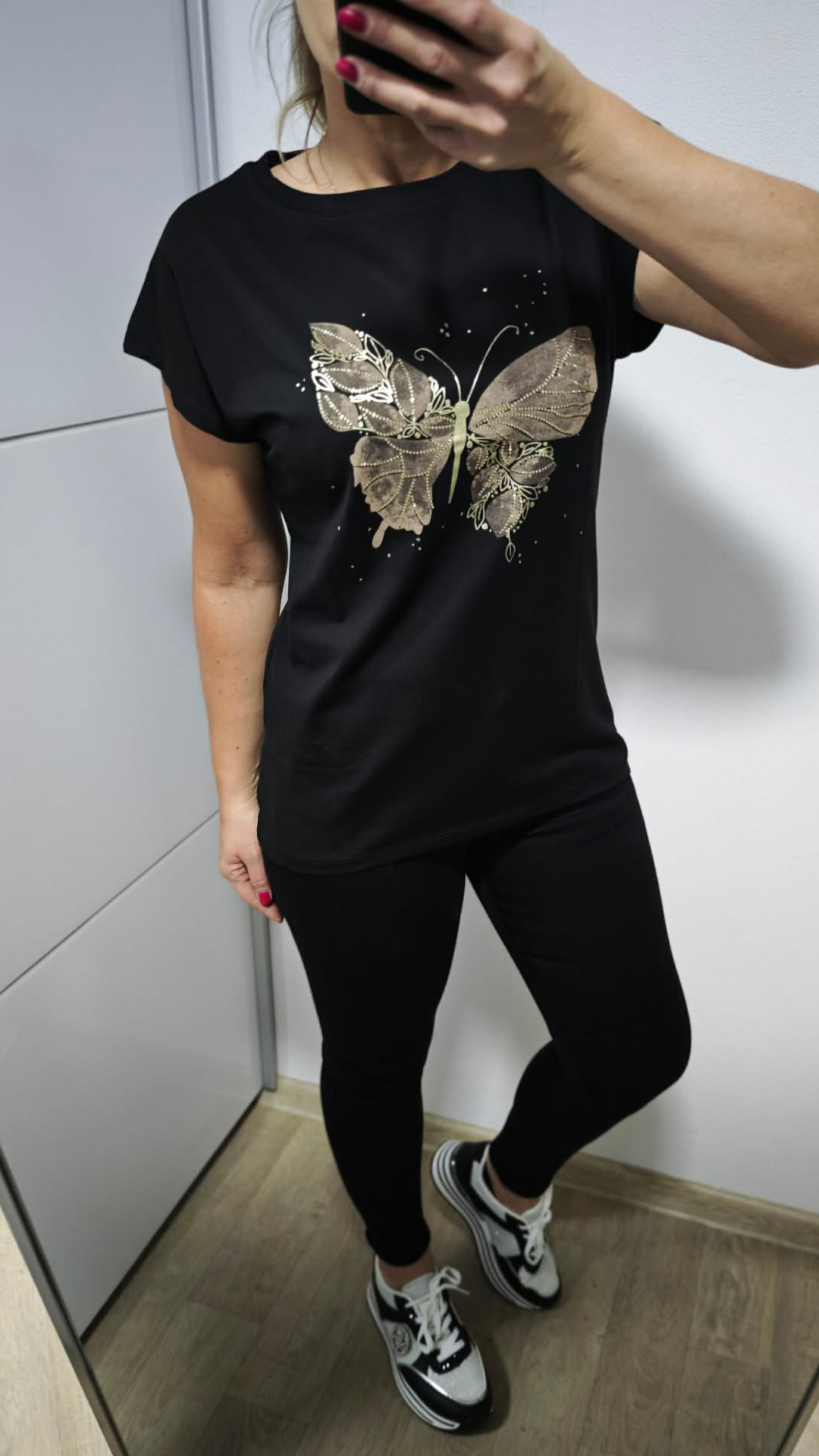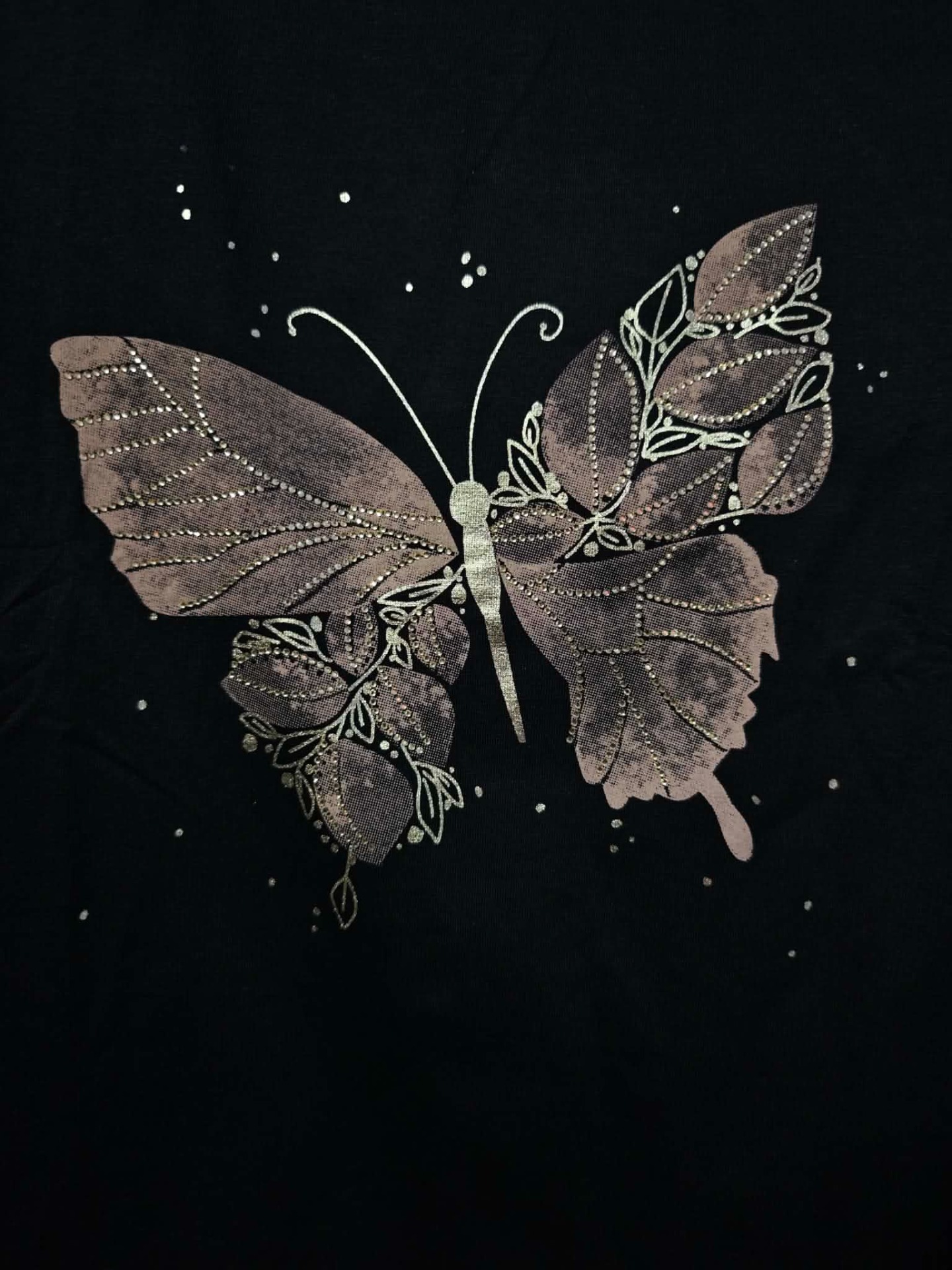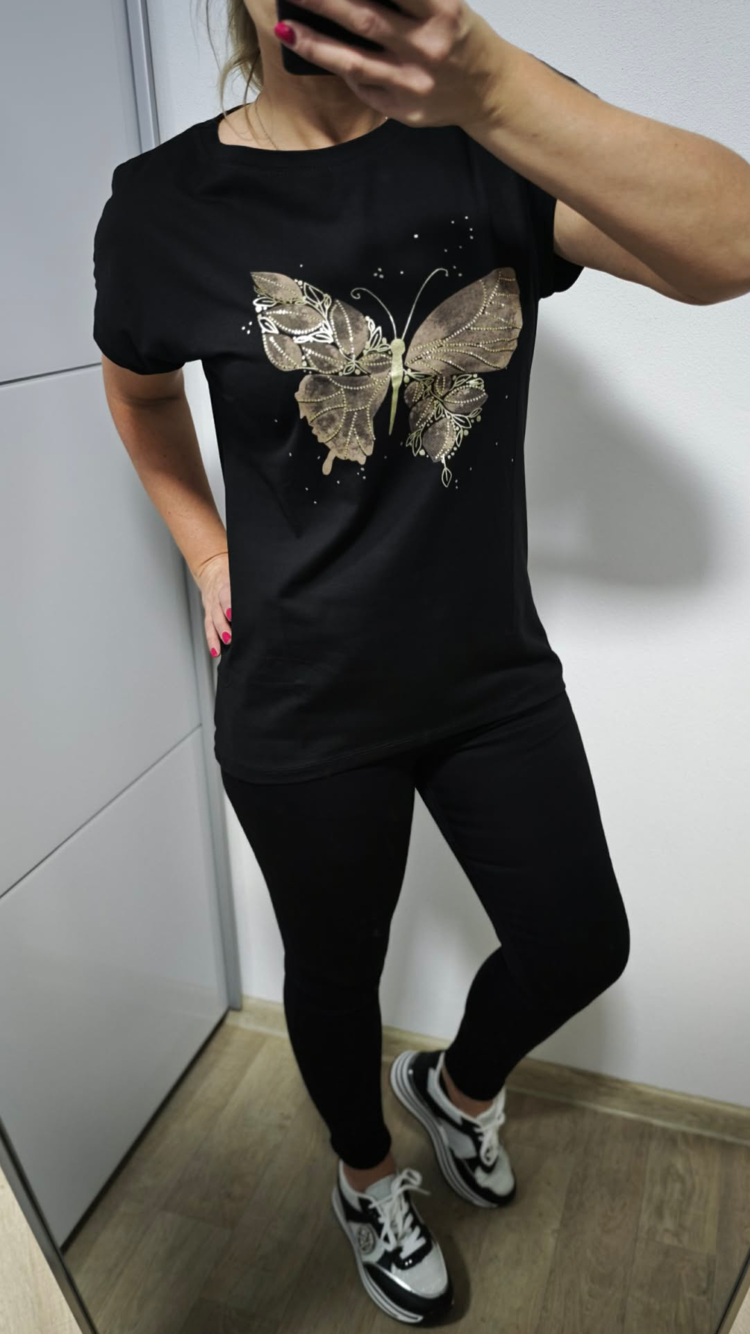 Stylové černé dámské tričko ZAREL je ideální kousek pro každodenní outfit s nádechem elegance. Dominantou je výrazný zlatý potisk motýla doplněný o jemné zlaté kamínky, které tričku dodávají luxusní a nepřehlédnutelný vzhled.
